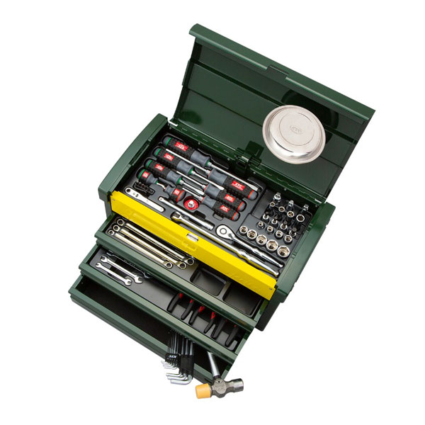 ●チェストトップ部の深さを活かし、ソケット、エクステンションバーやユニバーサルジョイントなどの駆動工具類を立てて収納する新型トレイを採用しました。