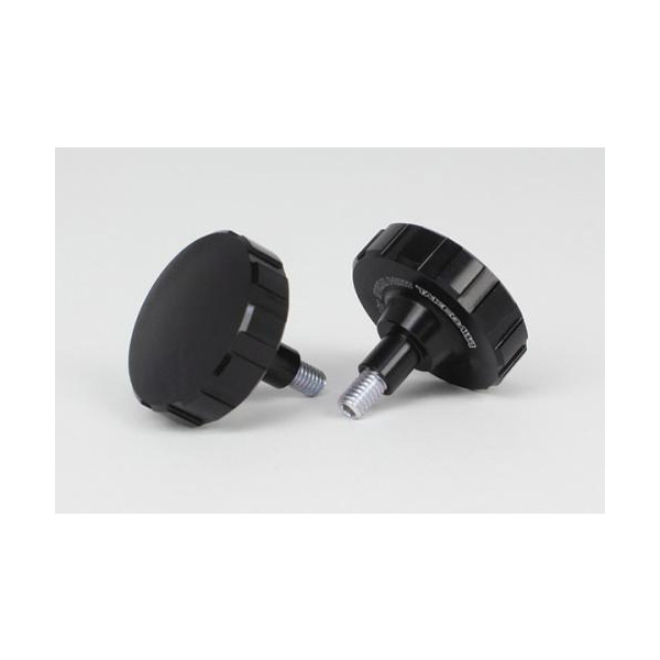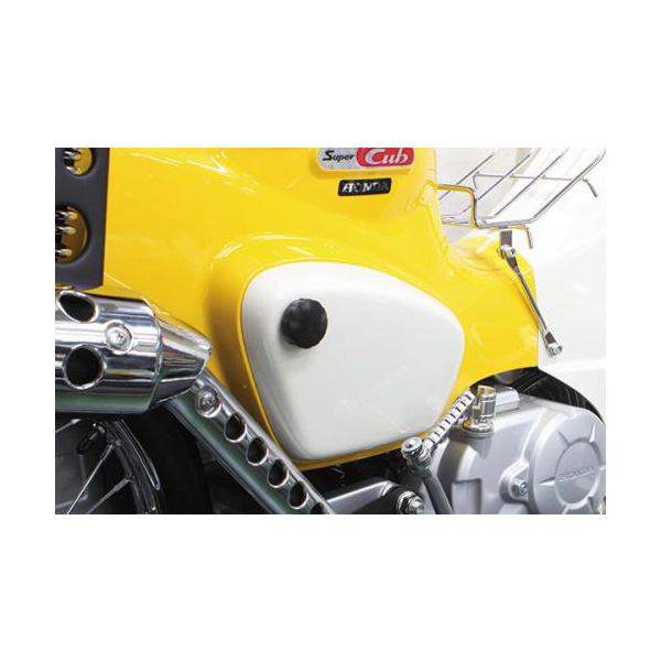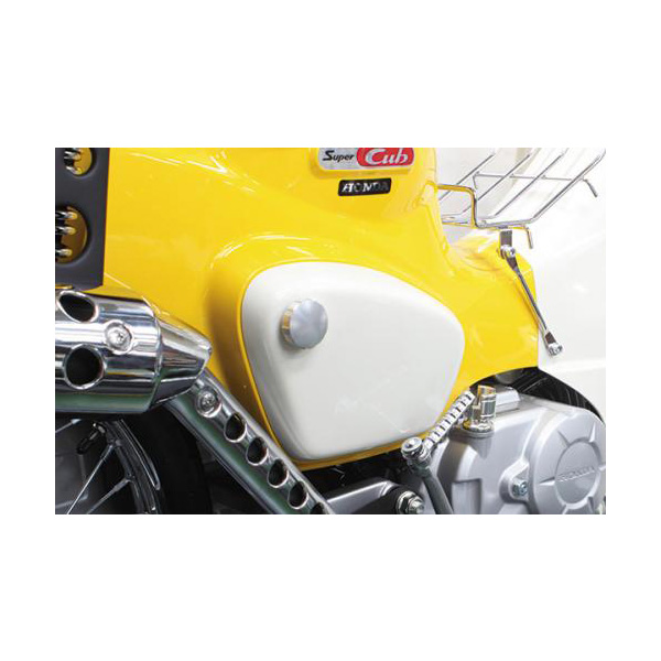 旧型スーパーカブに採用されていたサイドカバーノブをモチーフにアルミ材を精巧に削り出し、表面にアルマイトを施しています。