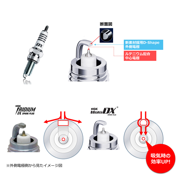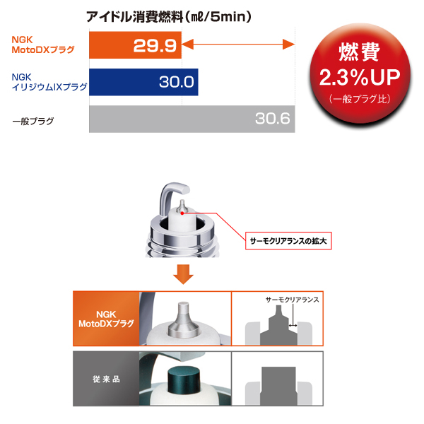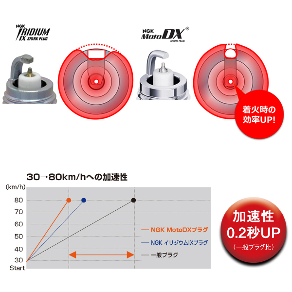 2輪専用スパークプラグとして、スパークプラグに求められる様々な性能(加速性・耐久性・耐汚損性・燃費・始動性等)を向上。