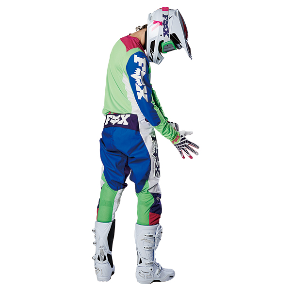 サンプルの検証に数えきれない程の時間を費やし、一段と高いレベルの製品の開発に成功した。FOX独自の4方向にストレッチするTruMotionファブリックを随所に用い、摩耗しやすい個所には900D ポリエステル生地を使用することで高い耐久性を実現。独自の縫製パターンであるRAP(ライダーアタックポジション)を採用した360パンツは、モトクロス特有の激しい動きにも驚くほど柔軟に対応する。