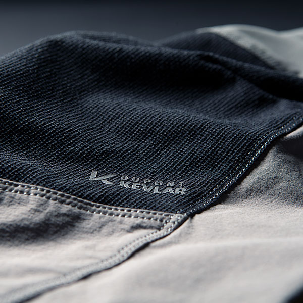 1: 耐摩耗性に優れた「KEVLARRFABRIC」を膝パネルに採用しクラッシュ時の引裂き等を防ぐ。