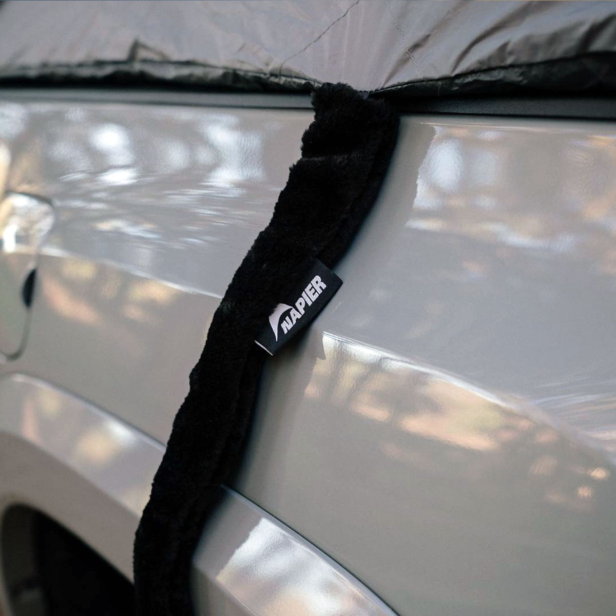 スポーツストラッププロテクターはトラックテントを組み付ける際に、テントストラップによる車体へのスリ傷を防ぐ。毛羽立った表面が滑らかにスライドして、ボディーを傷つけることなく組み付けできる。ネイピア トラックテント全モデルに使用可能。内容: 6本入り