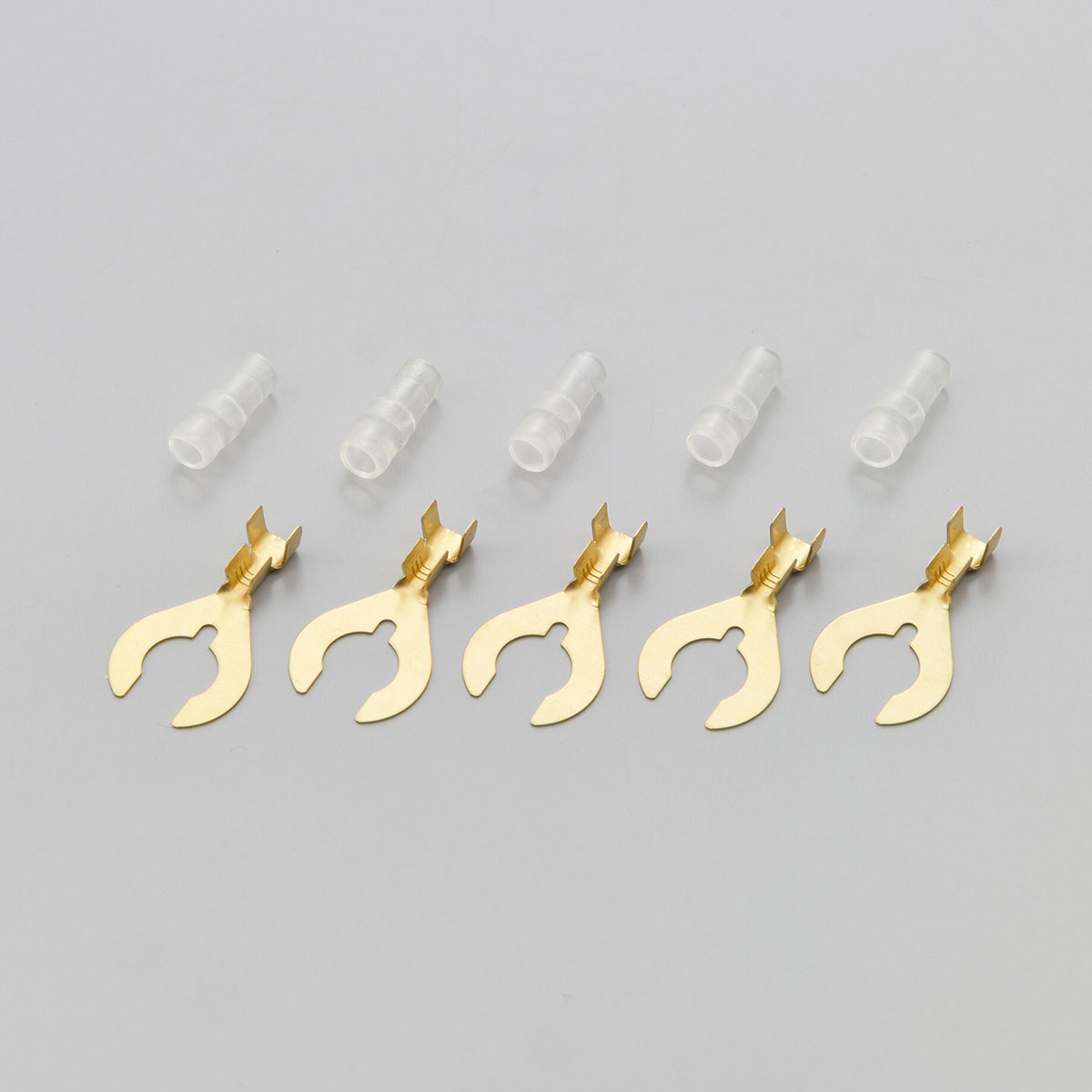 ハンドツールかしめ用のうす板タイプ・クワ型端子/スリーブ・各5個・材質:黄銅・表面処理:防錆処理・適合電線サイズ:AVまたはAVS0.5〜2.0・台湾製