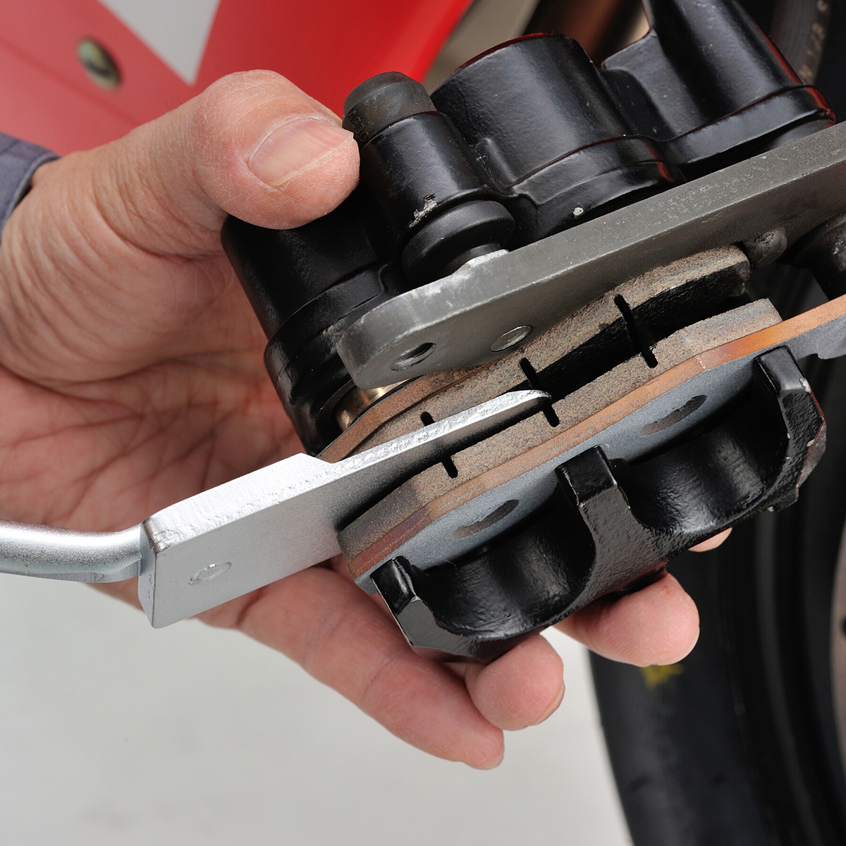 パッド交換作業時にキャリパーのピストンを戻す専用工具。こじって使用する際、先端が薄く設計されているため出過ぎたピストンを戻すのにぴったりです。