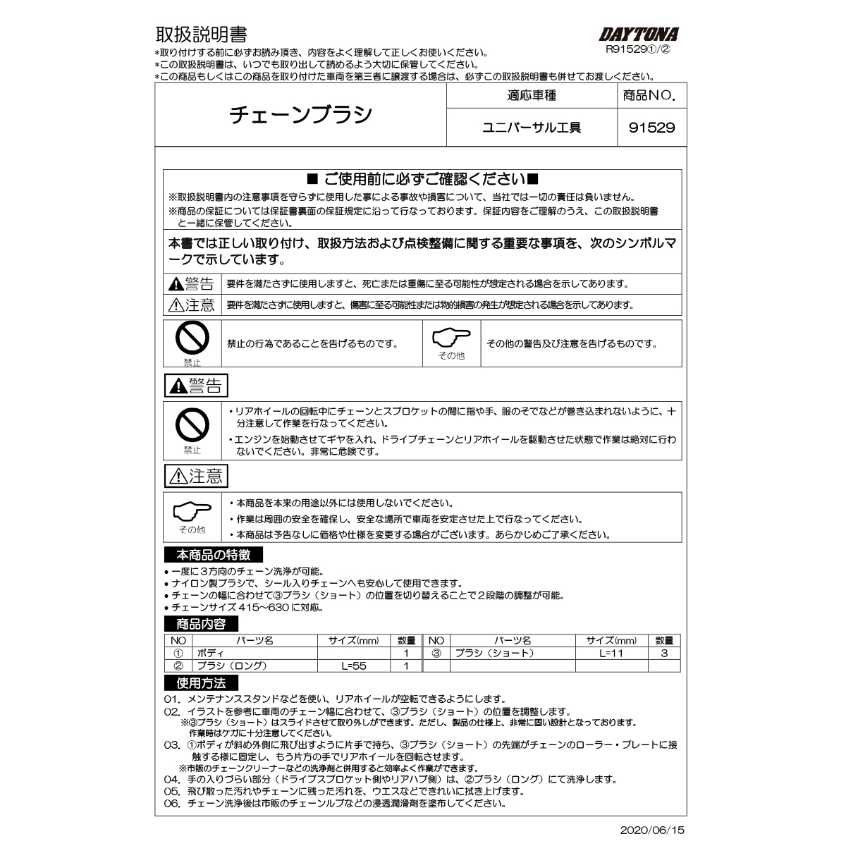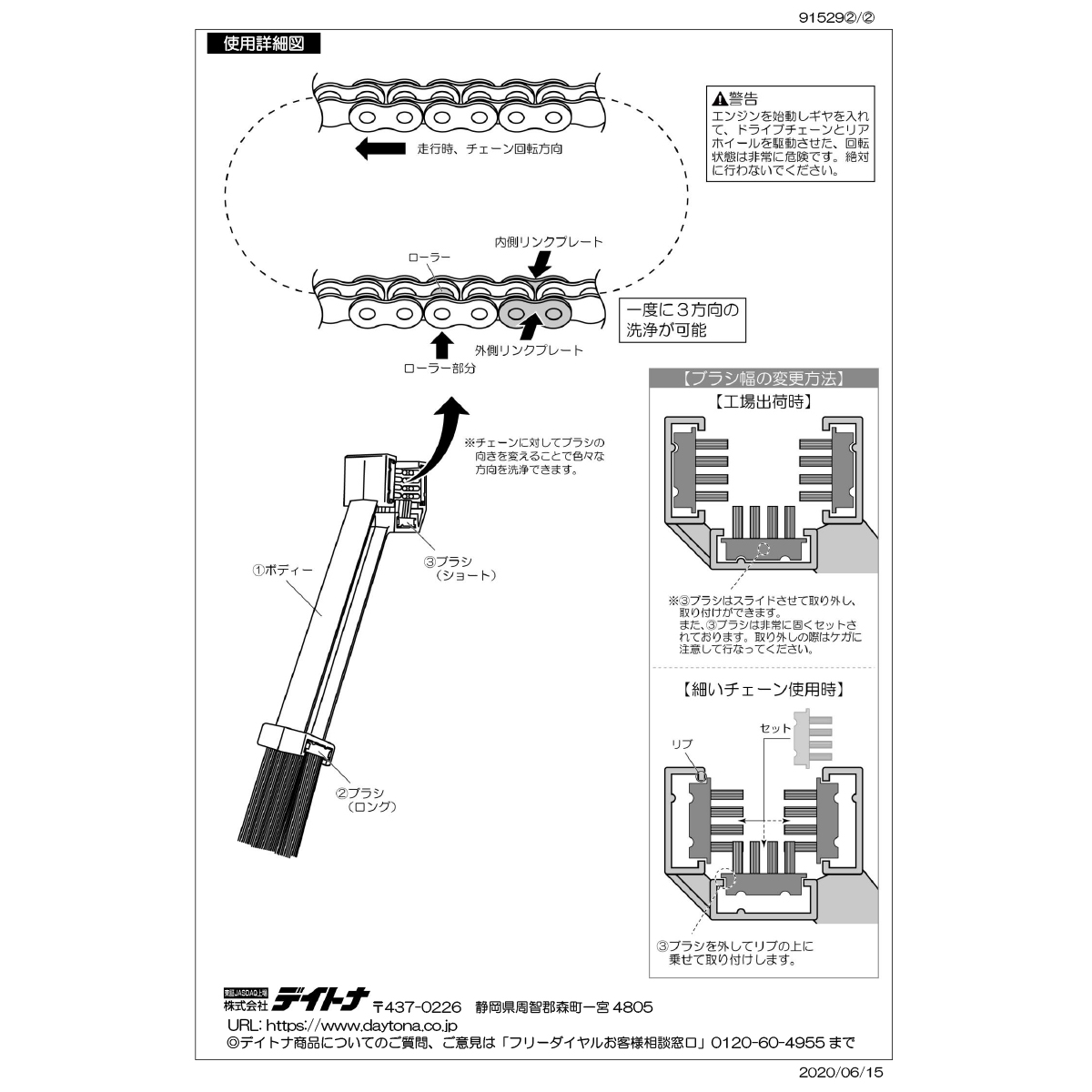 カンタン便利なチェーンクリーニングの必需品。一度に3面洗浄できる3面ブラシと、より細かな汚れ落としに便利なロングブラシのコンビネーション。各ブラシは取り外しできます。チェーンサイズ#415〜#630まで使用可能。ナイロンブラシでシール入りェーンにも安心。
