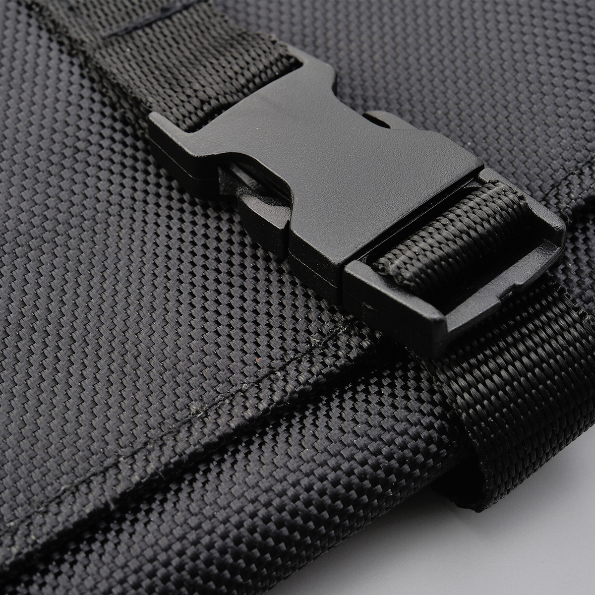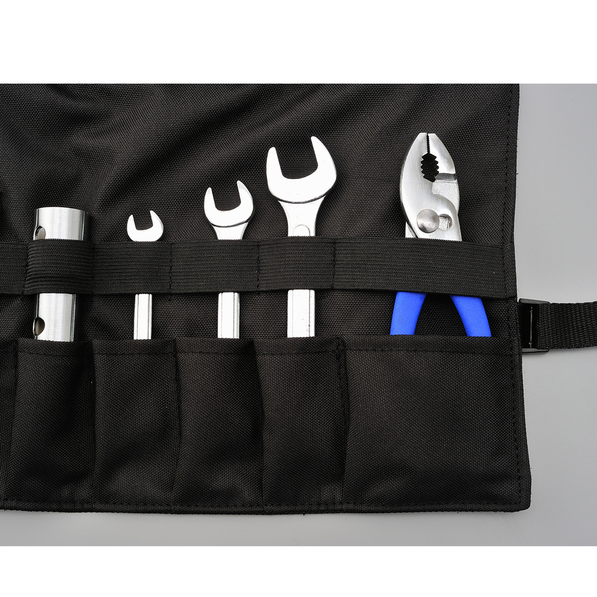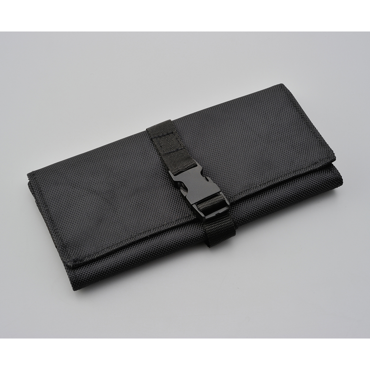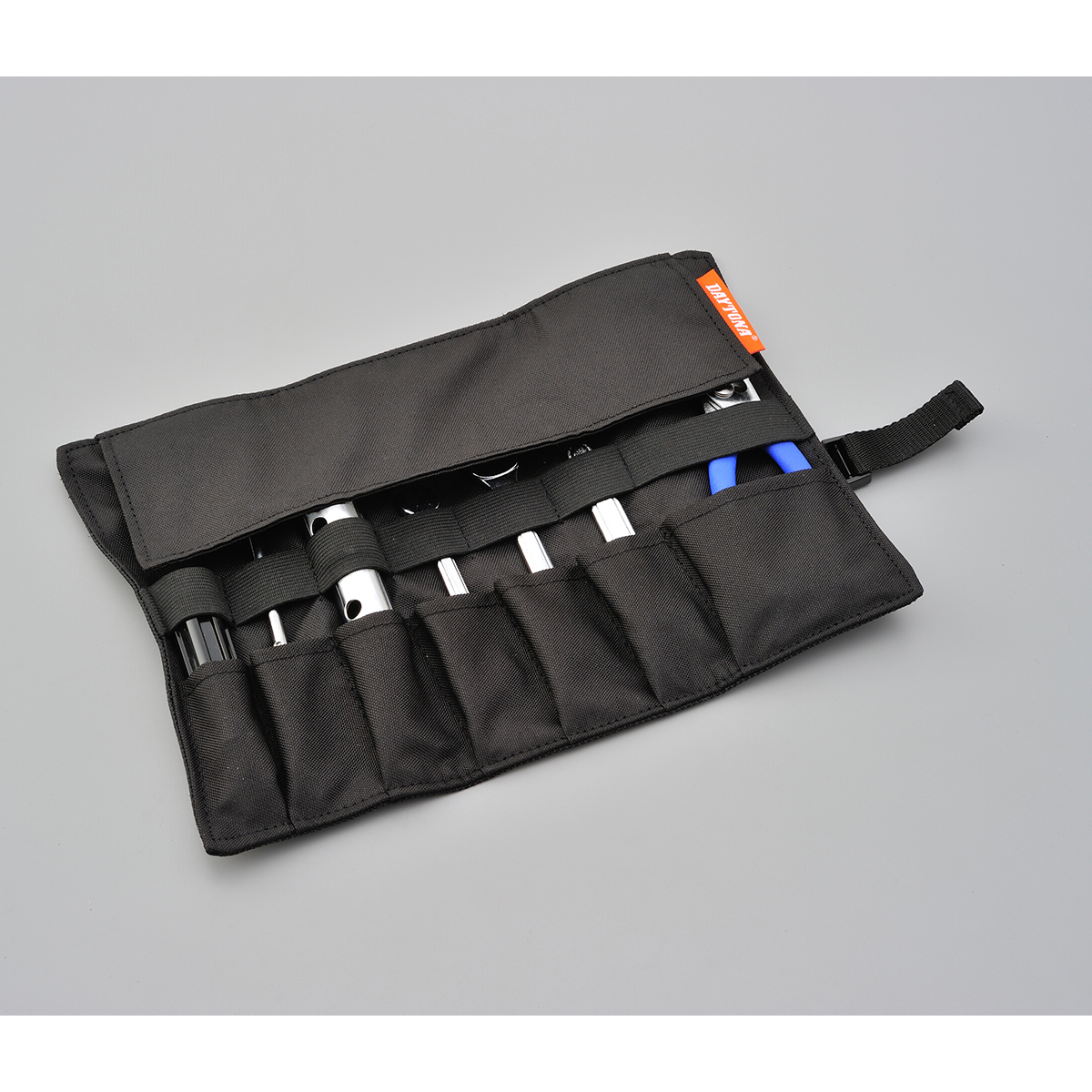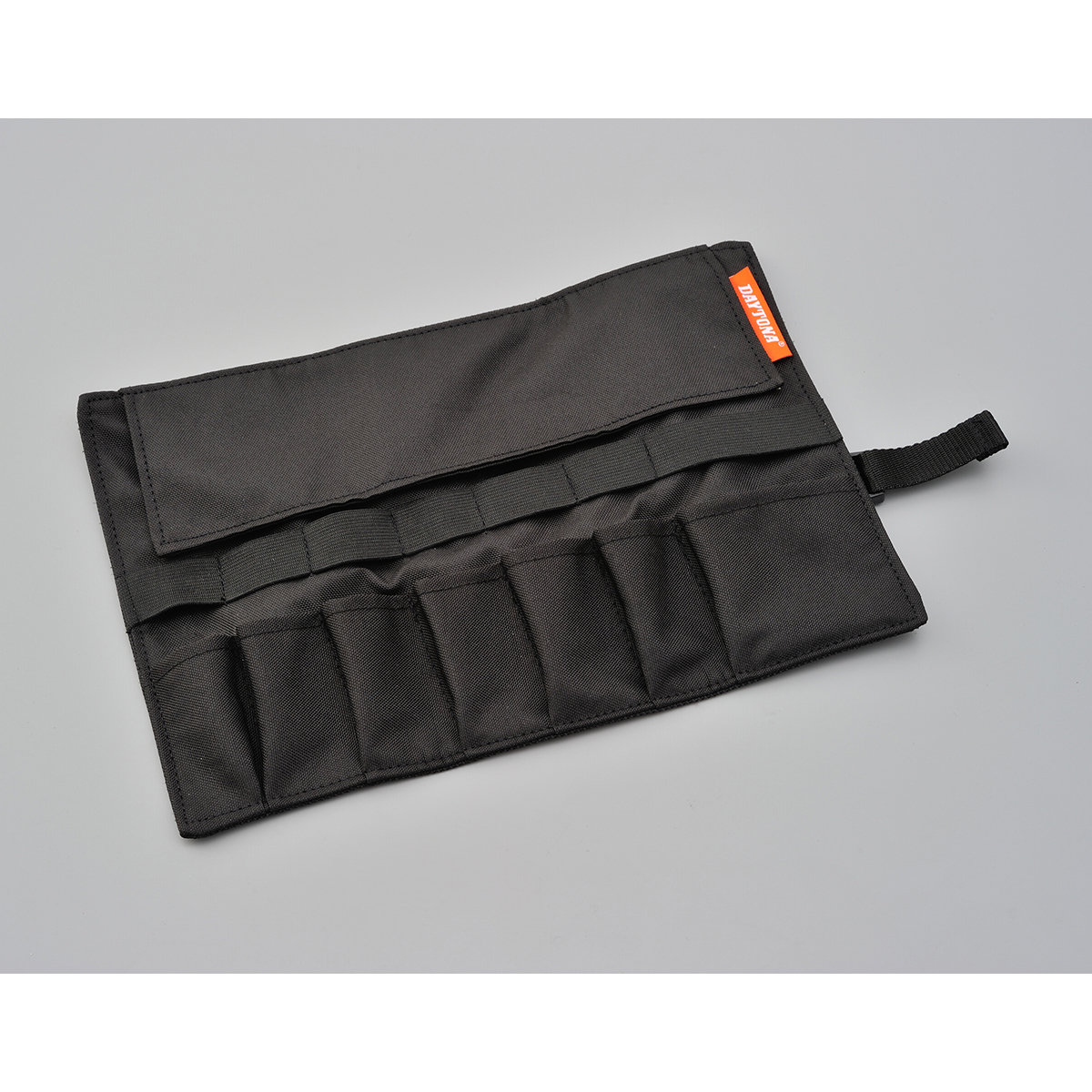 ひとめで必要な工具を見つけることができるナイロン製ロール式ツールバッグ。工具の落下を防止するカバーとゴムバンド付き。カバーは大型なので、短い工具でもケースから脱落しにくく、サイズの違う収納ポケットは工具の整理収納が可能です。丸めた状態に合わせ、バンドの長さを調節できます。