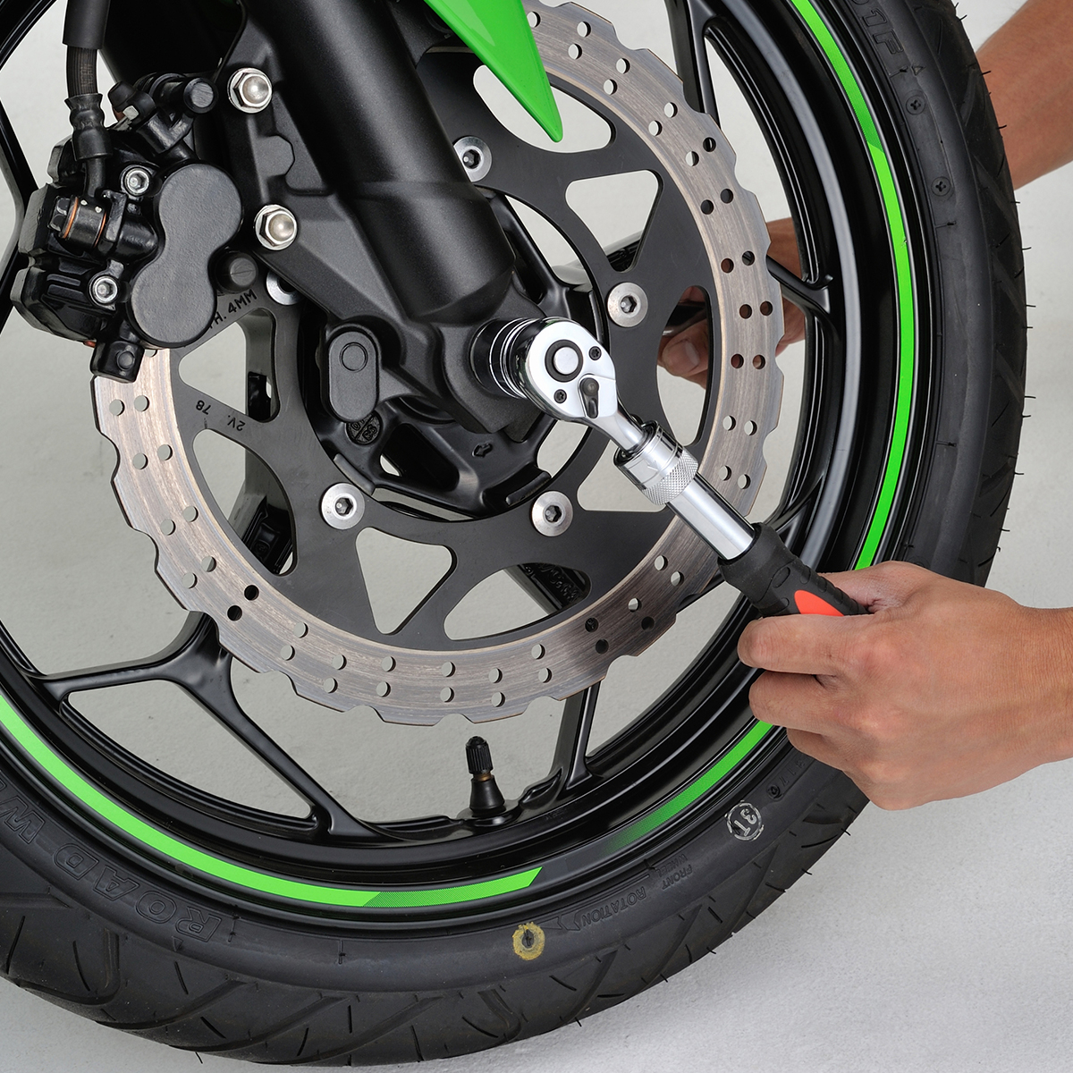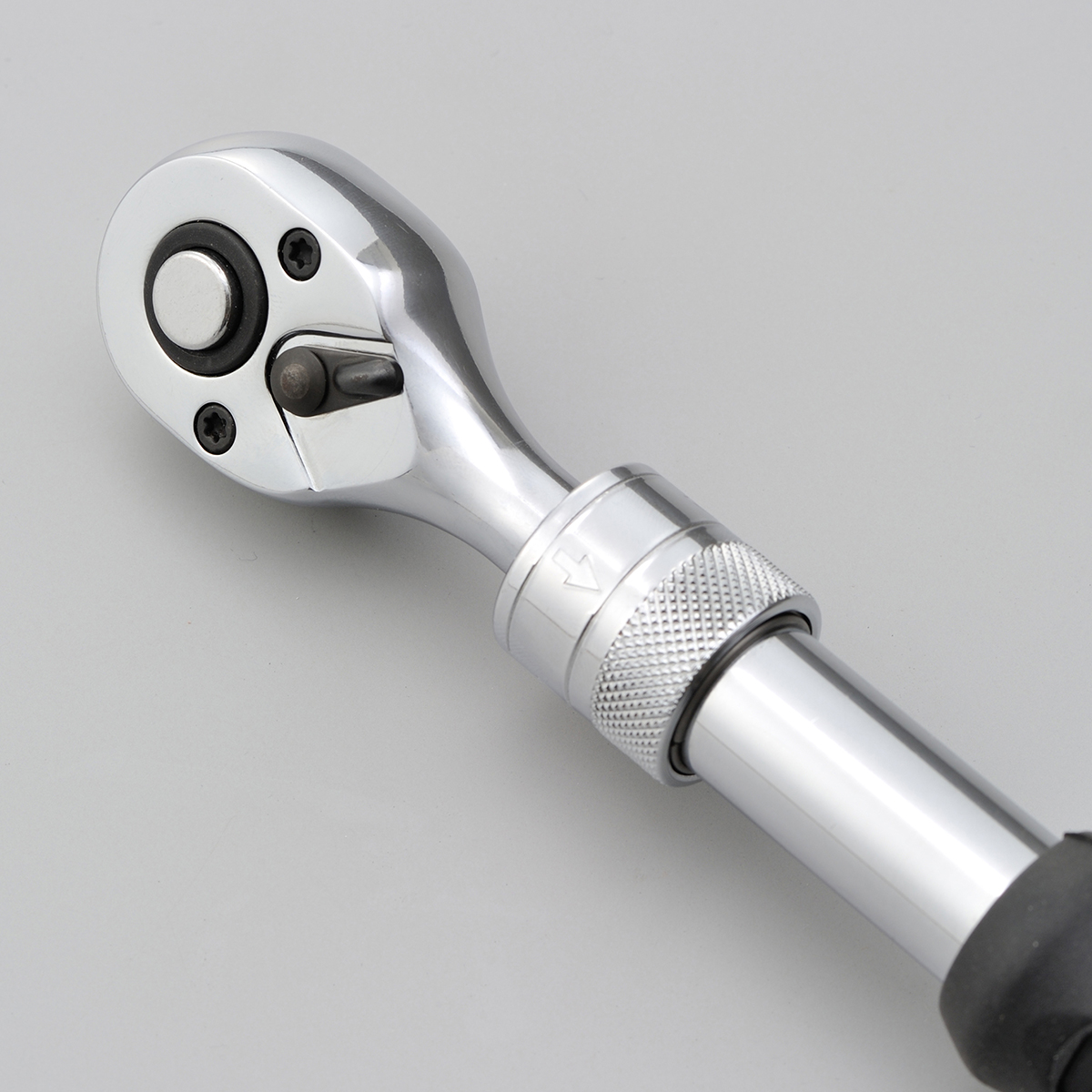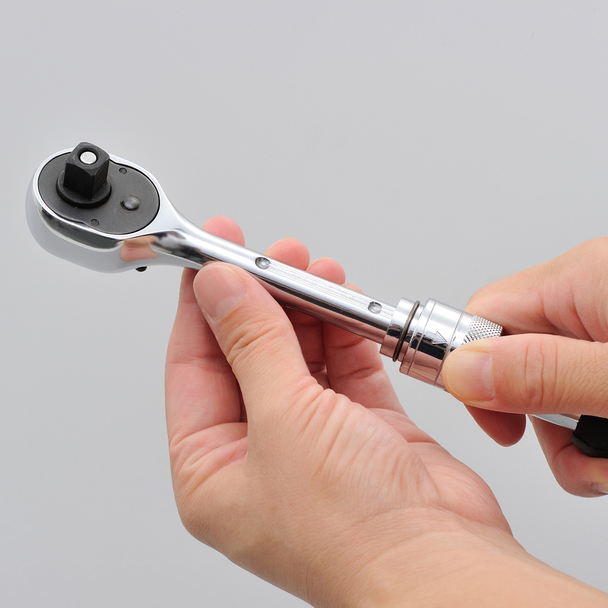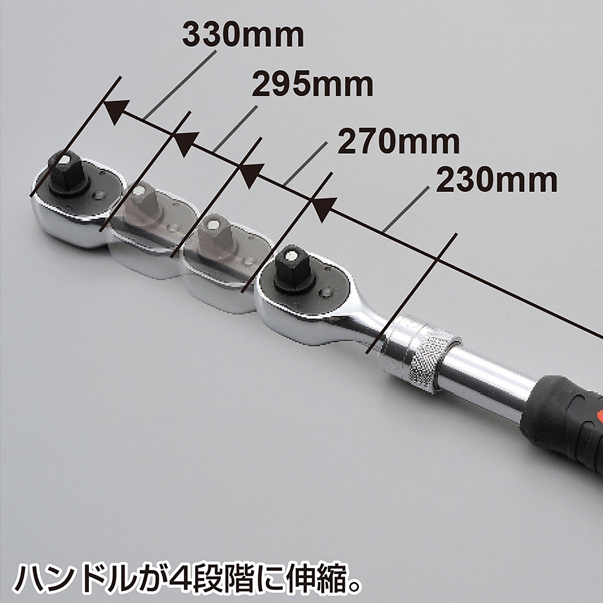 ハンドルが4段階に伸縮するので、通常は縮めた状態でスピーディーに、大きなトルクが必要なときは伸ばして使用できるラチェットレンチです。プッシュ式クイックリリース機構付き。