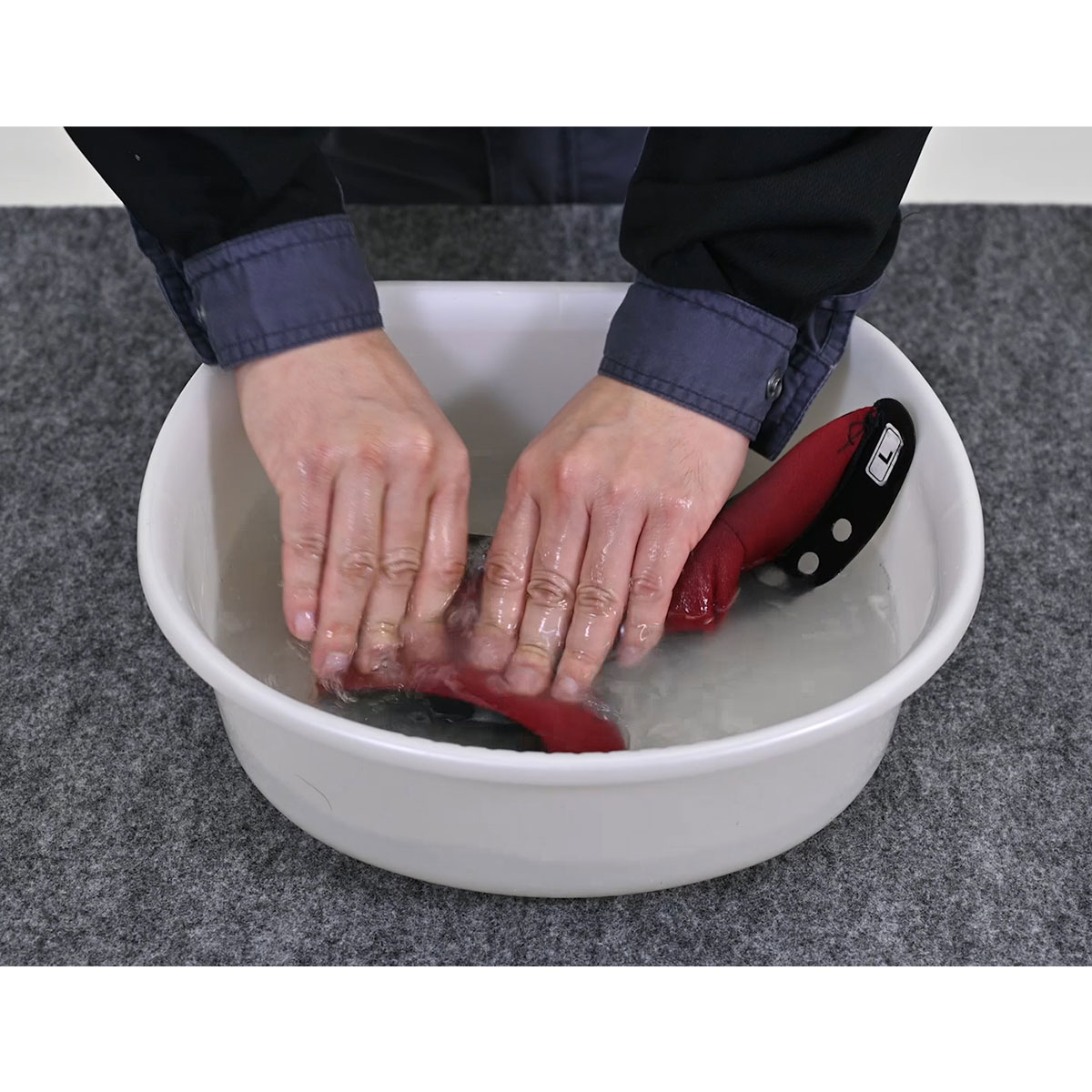 水またはお湯(40℃程度推奨)2Lに対し、本製品1袋(5g)を投入して、溶液としたうえで、ヘルメット内装を溶液に漬け込み、優しく押し洗いしてください。洗浄後、ヘルメット内装を水で十分すすいで溶液を洗い流し、タオル等で軽く脱水して陰干ししてください。
