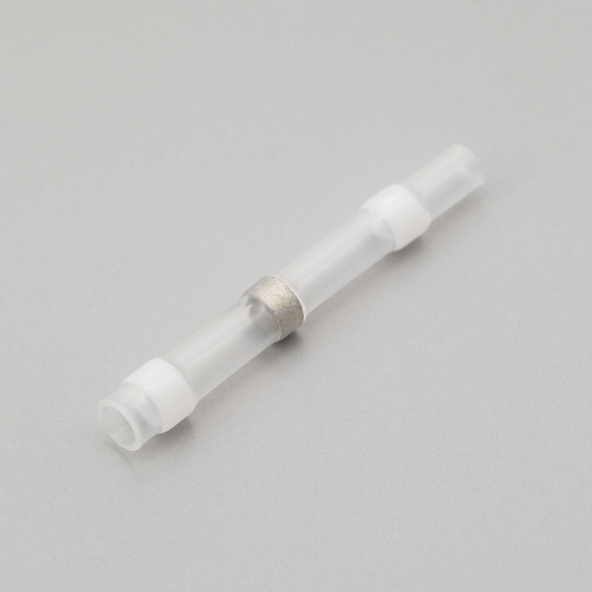 リング状のハンダが入った収縮チューブ。線の継目にダブルリングのハンダが溶け込み収縮することで確実&楽に結線可能。透明なので作業しやすい。チューブ内の色付の溶着材が加熱時に配線に密着することで、施工後の抜け防止・防水に役立ちます。