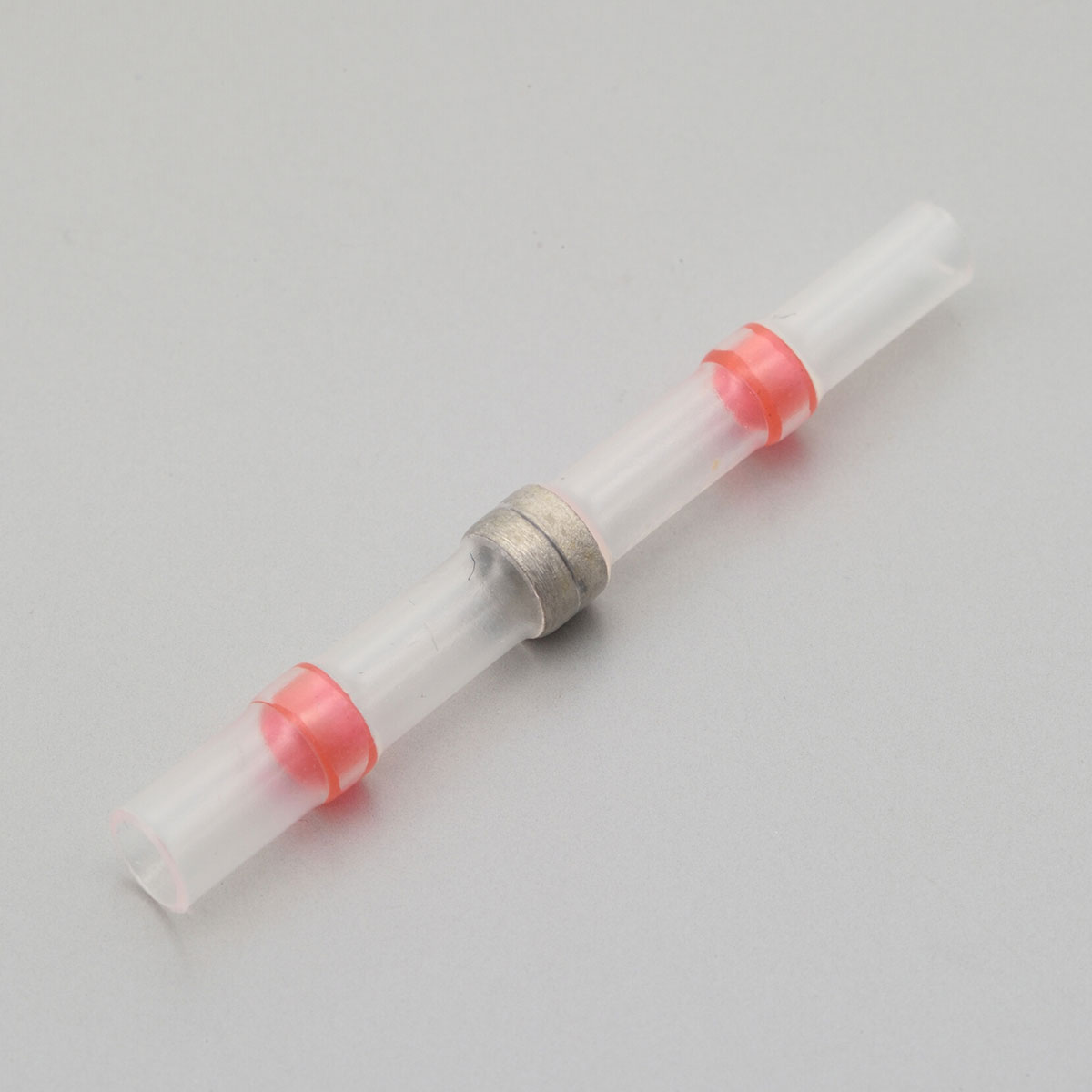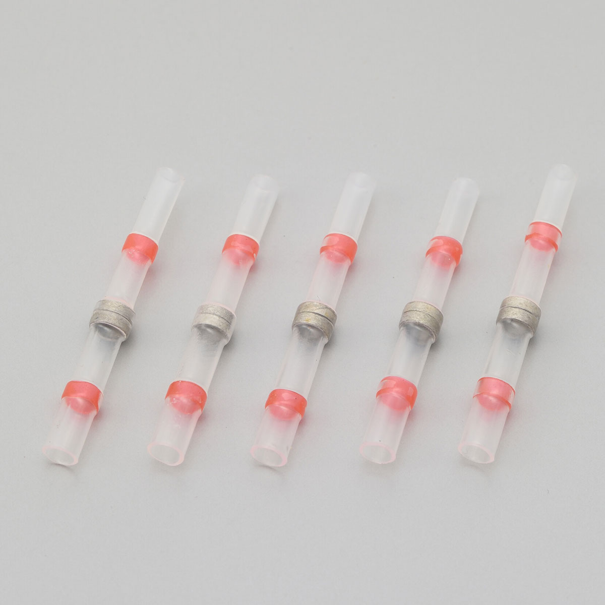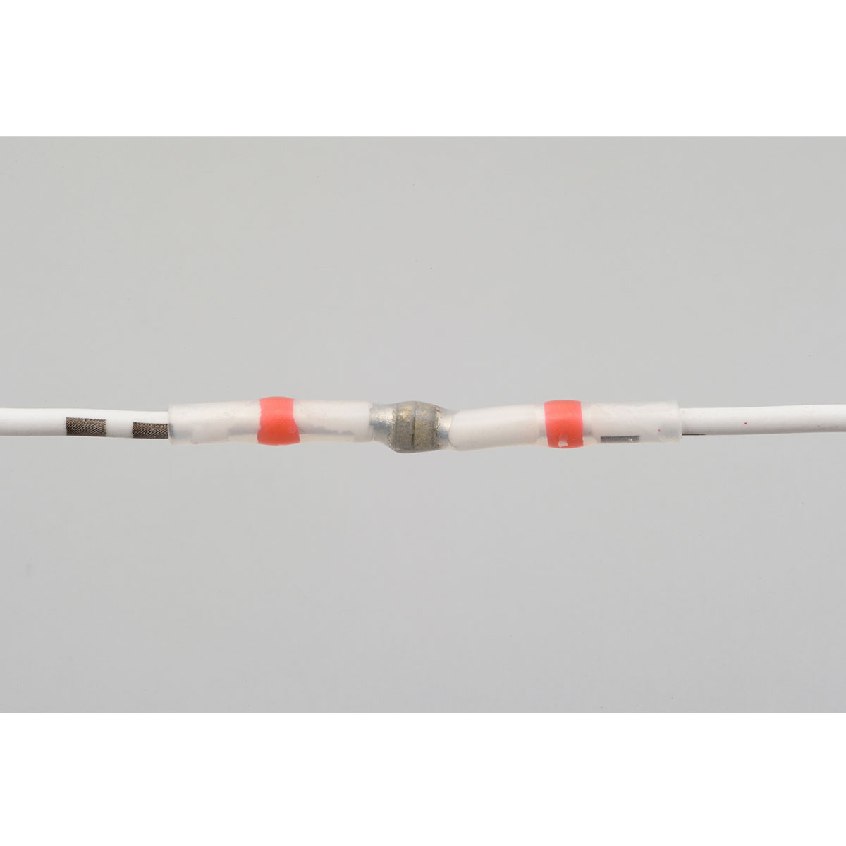 リング状のハンダが入った収縮チューブ。線の継目にダブルリングのハンダが溶け込み収縮することで確実&楽に結線可能。透明なので作業しやすい。チューブ内の色付の溶着材が加熱時に配線に密着することで、施工後の抜け防止・防水に役立ちます。