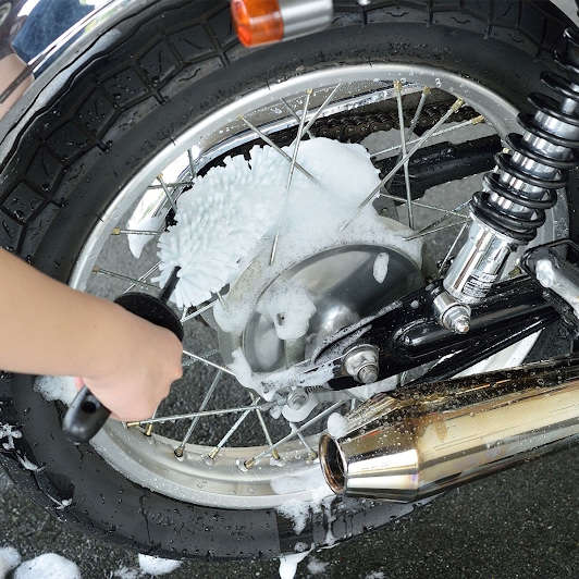 スポークやホイールなどの手が入りにくいすきまに最適。傷がつかないようにブラシの毛はスポンジになっています。ブラシを折り曲げて作業でき、ブラシ先端には傷防止用カバーがついているので、車体を傷つけず安心です。