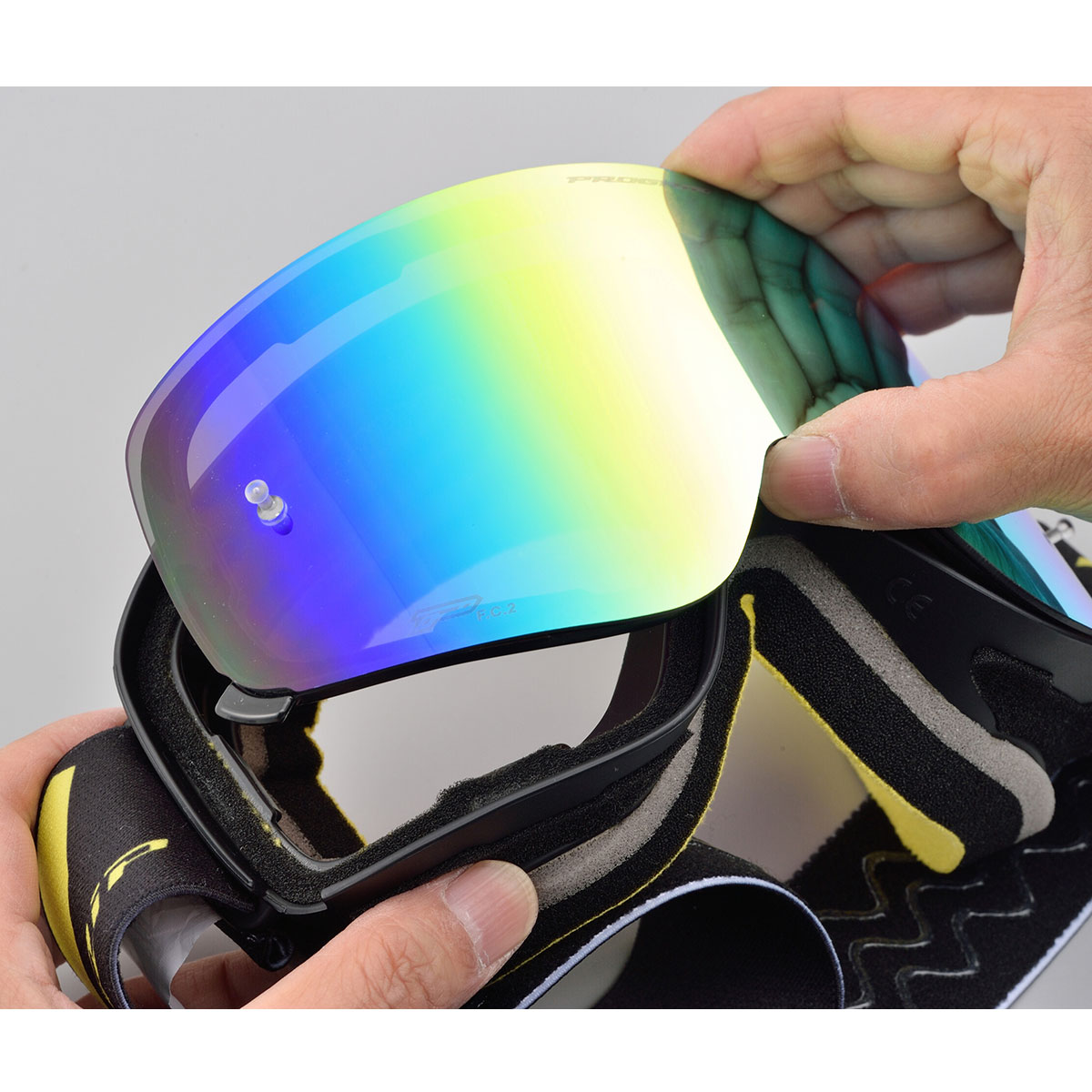 スノー系ウインタースポーツではトレンドのフレームレスデザイン。レンズは磁石固定式なので別売のレンズを用意すれば天候に合わせてレンズ色を簡単に変更できる優れもの。当社モトクロス好きスタッフ(国際B級)がハードに実走テストをしても磁石が強力なのでレンズが外れることはありませんでした。