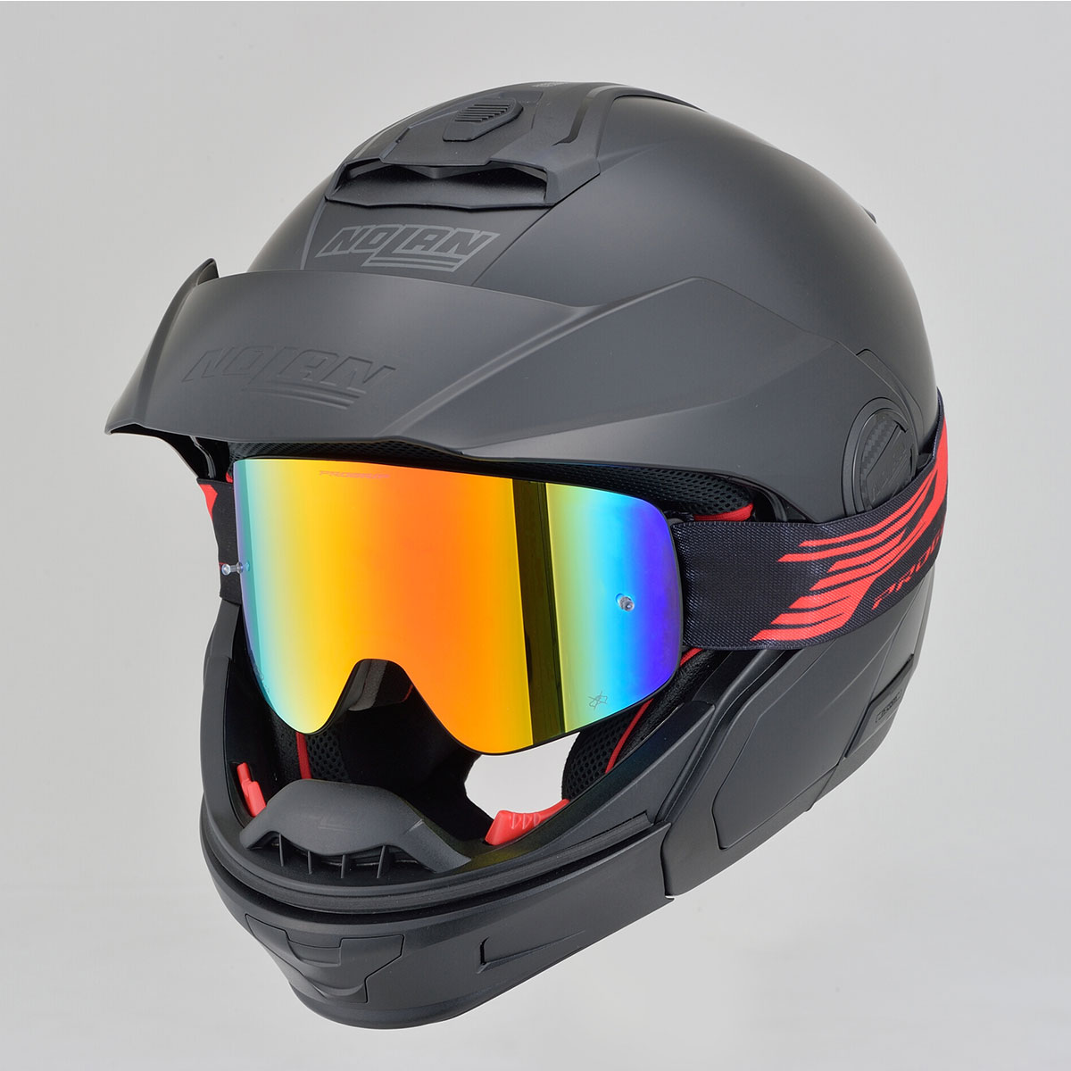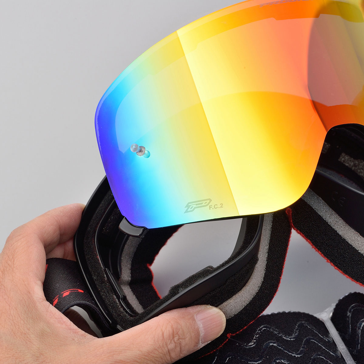 スノー系ウインタースポーツではトレンドのフレームレスデザイン。レンズは磁石固定式なので別売のレンズを用意すれば天候に合わせてレンズ色を簡単に変更できる優れもの。当社モトクロス好きスタッフ(国際B級)がハードに実走テストをしても磁石が強力なのでレンズが外れることはありませんでした。