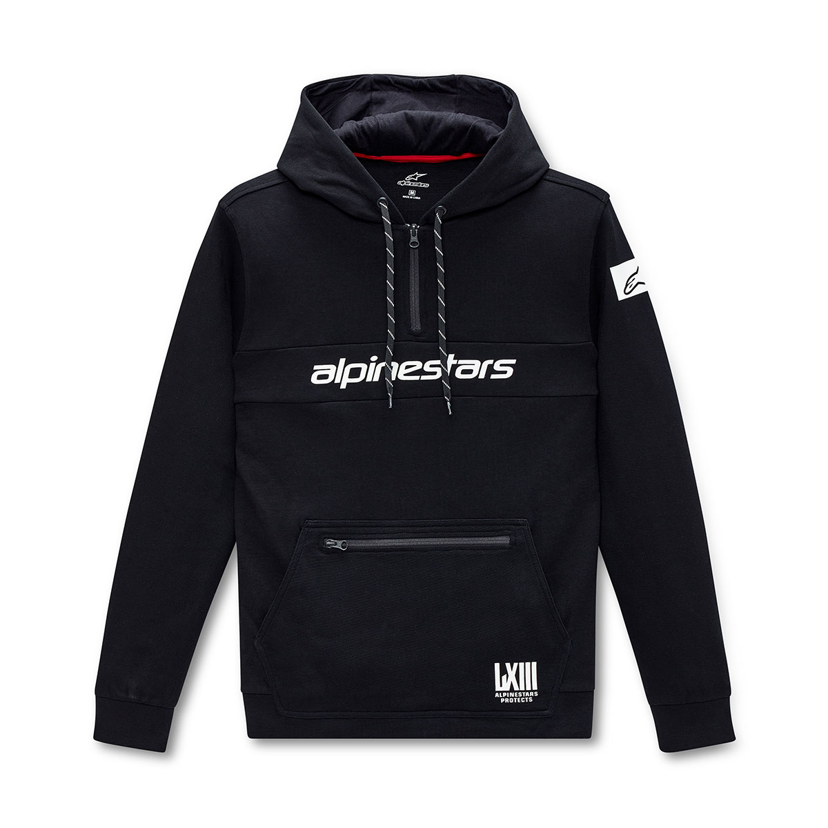 アルパインスターズオリジナルデザインをあしらった1/4ジップアップフーディー。フロントにはジッパーポケットとカンガルーポケットを備える。