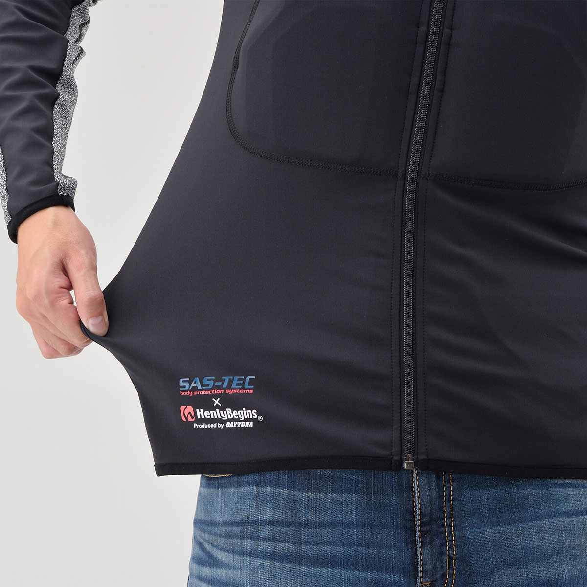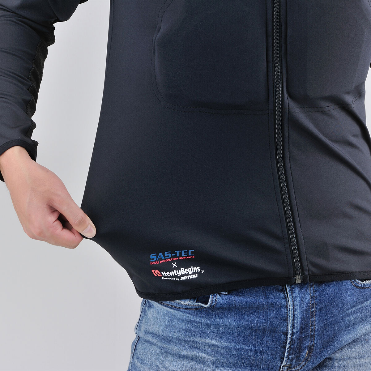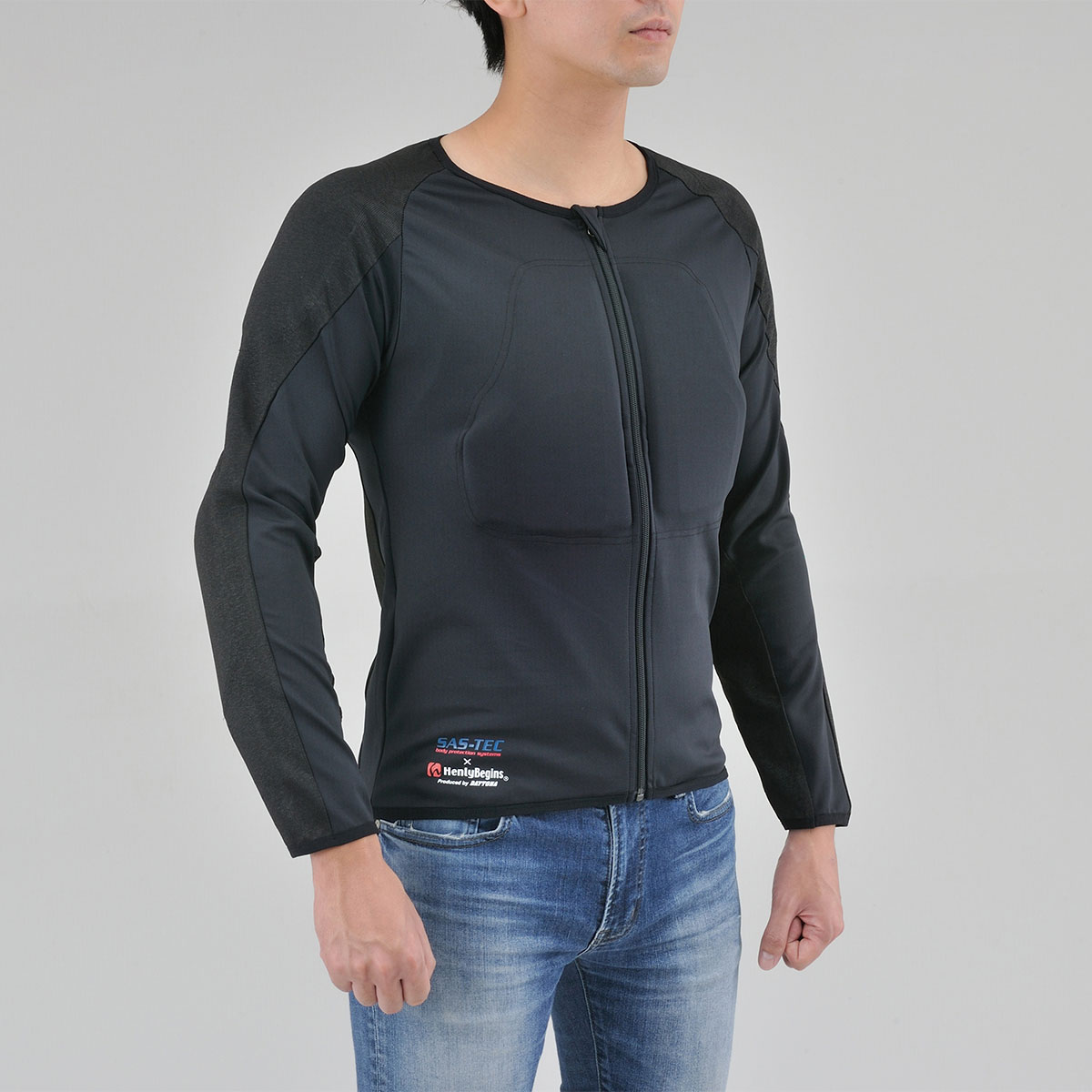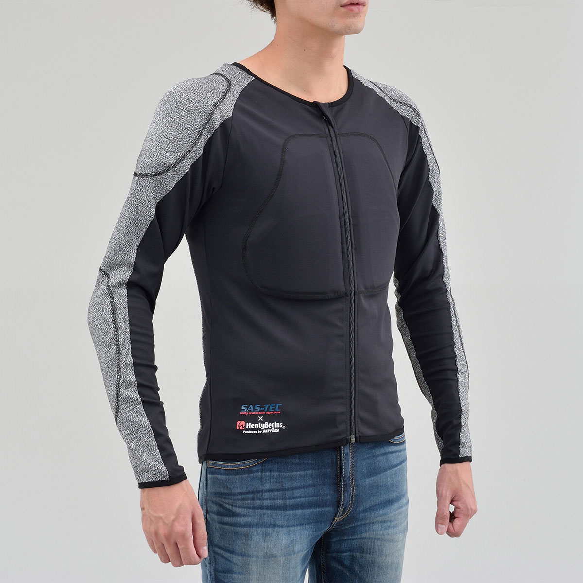 摩耗に強い特殊生地「HPPEマテリアル」を腕と背中に、その他の部位にはストレッチ生地を採用し、衝撃時に瞬間硬化するSASTEC製プロテクターを胸部・ひじ・肩・背中に装備することで、体へフィットしたソフトな装着感と安全性を両立させたインナープロテクター。