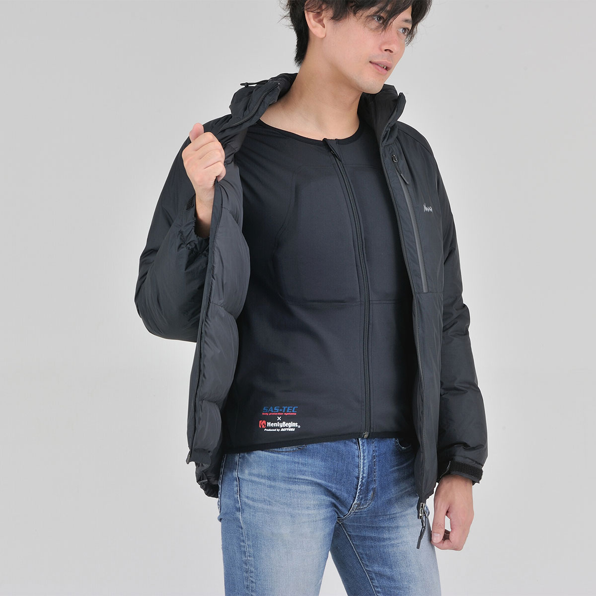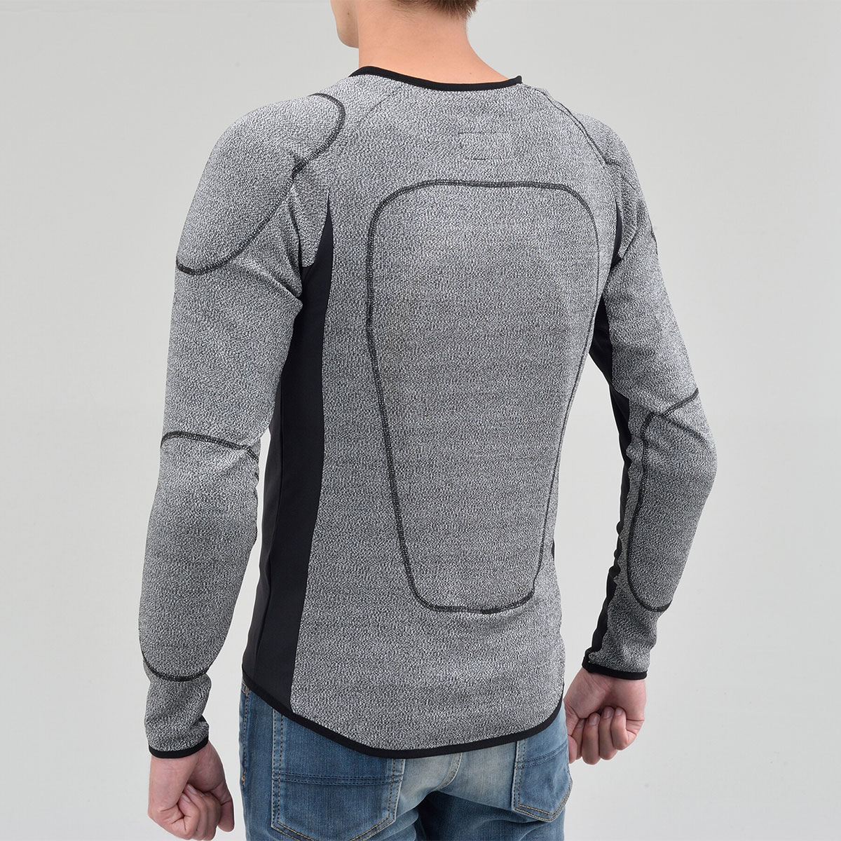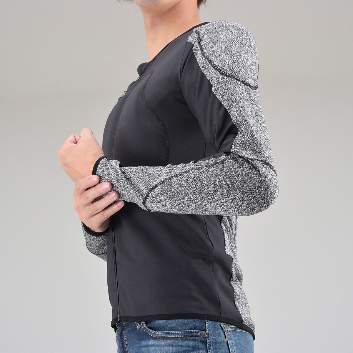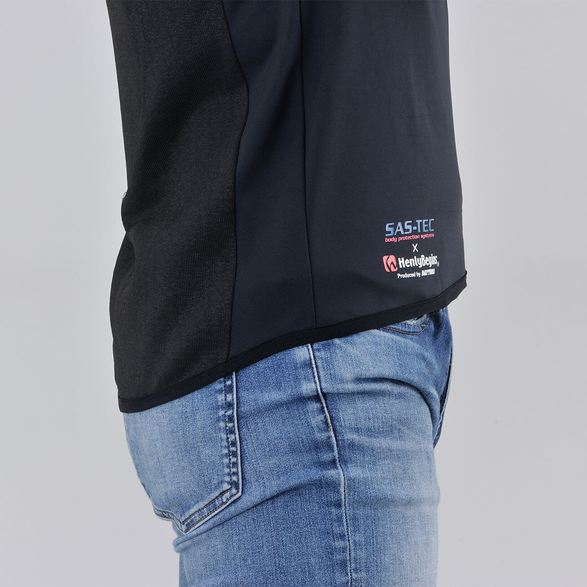 摩耗に強い特殊生地「HPPEマテリアル」を腕と背中に、その他の部位にはストレッチ生地を採用し、衝撃時に瞬間硬化するSASTEC製プロテクターを胸部・ひじ・肩・背中に装備することで、体へフィットしたソフトな装着感と安全性を両立させたインナープロテクター。