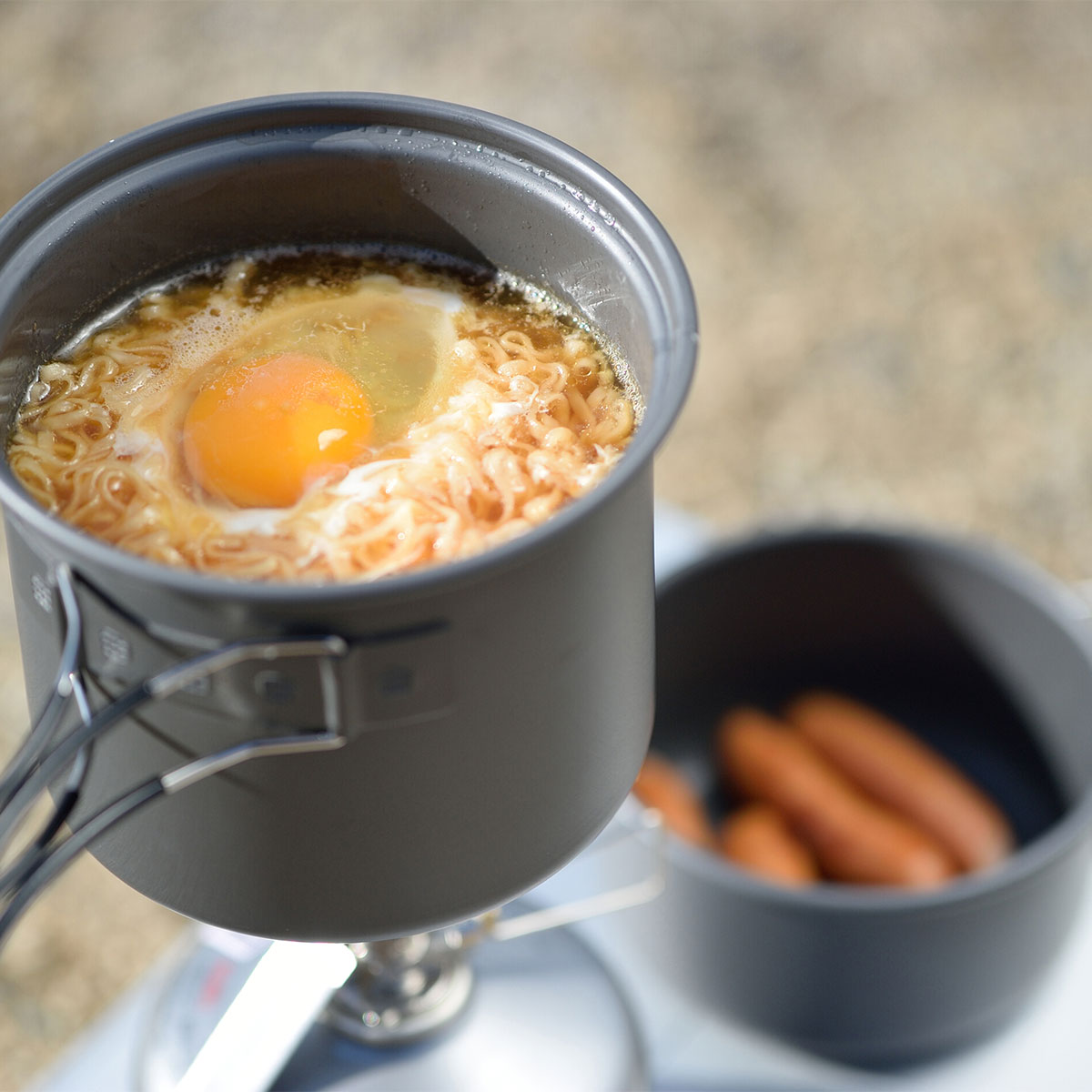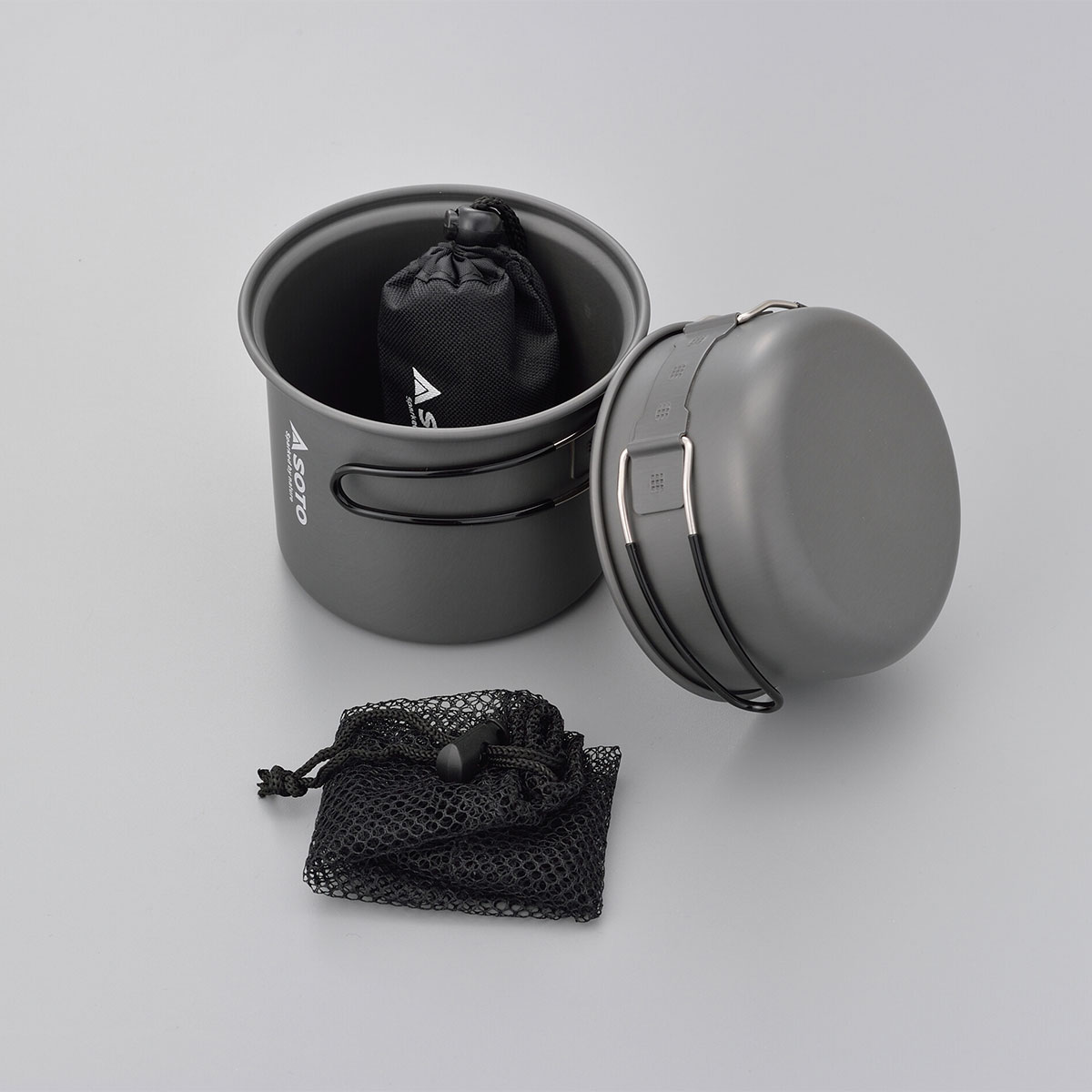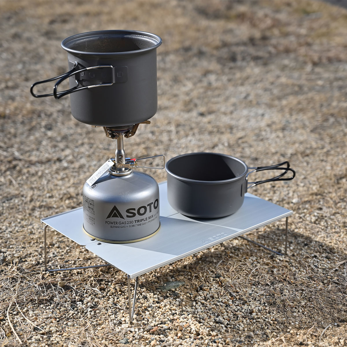 耐風性に優れたすり鉢状のバーナーヘッドや、耐衝撃性を向上させたステルスイグナイターなどSOTOの技術をバランスよく詰め込んだエントリーモデルの「アミカス」に燃料ボンベが収まるアルミ製クッカー(大・小)をセットにしたモデルです。
