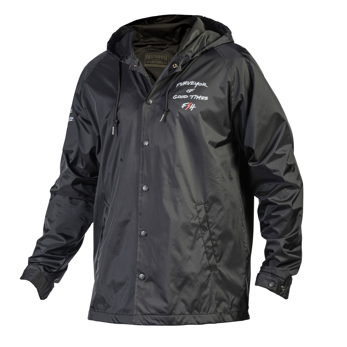 撥水加工を施した軽量なナイロンを使用したコーチジャケット。南カリフォルニアのタトゥーアーティストからインスピレーションを受けデザインされたプリントを施す。裏地にはポリエステル生地を使用し、快適な着心地を実現。フロントボタンタイプ。フードと袖は調節可能。