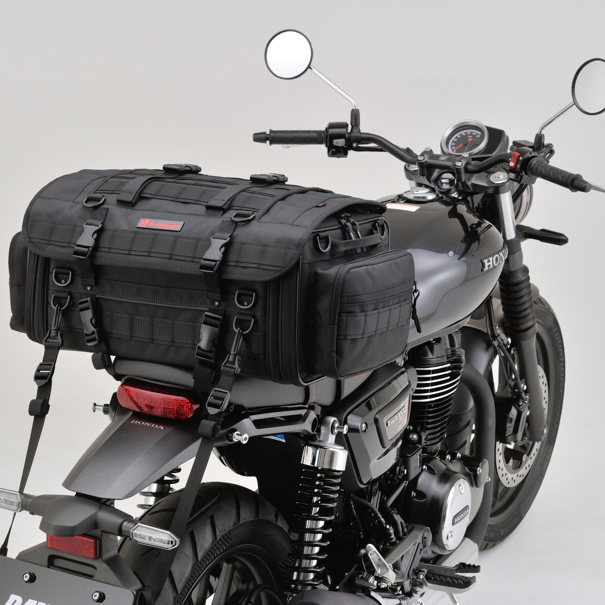 イージーリングベルトと4点支持ベルトで、バッグを強力に固定。中央の特殊ノンスリップシートは幅広い車種でズレを防止、YZF-R25・Ninja250などへの取り付けが可能です。