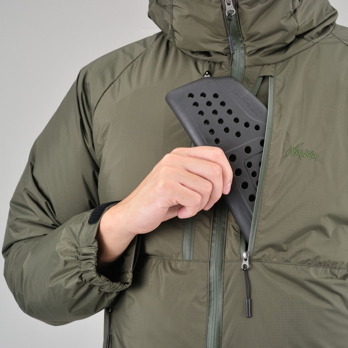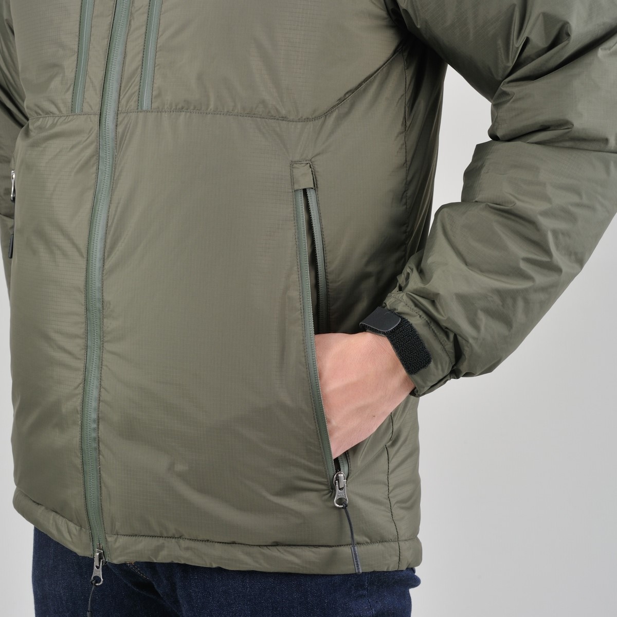 メインジップをはじめ、ポケット類のジップを全て止水ジップを使用。ポケットの内側には起毛素材、袖口はヌバックタイプのベルクロを取り付け、冷気の侵入を遮断。ジャケットの内側にはやわらかな生地を採用することで、羽毛が膨らみやすくなり、着用時の保温性やフィット感を高めます。