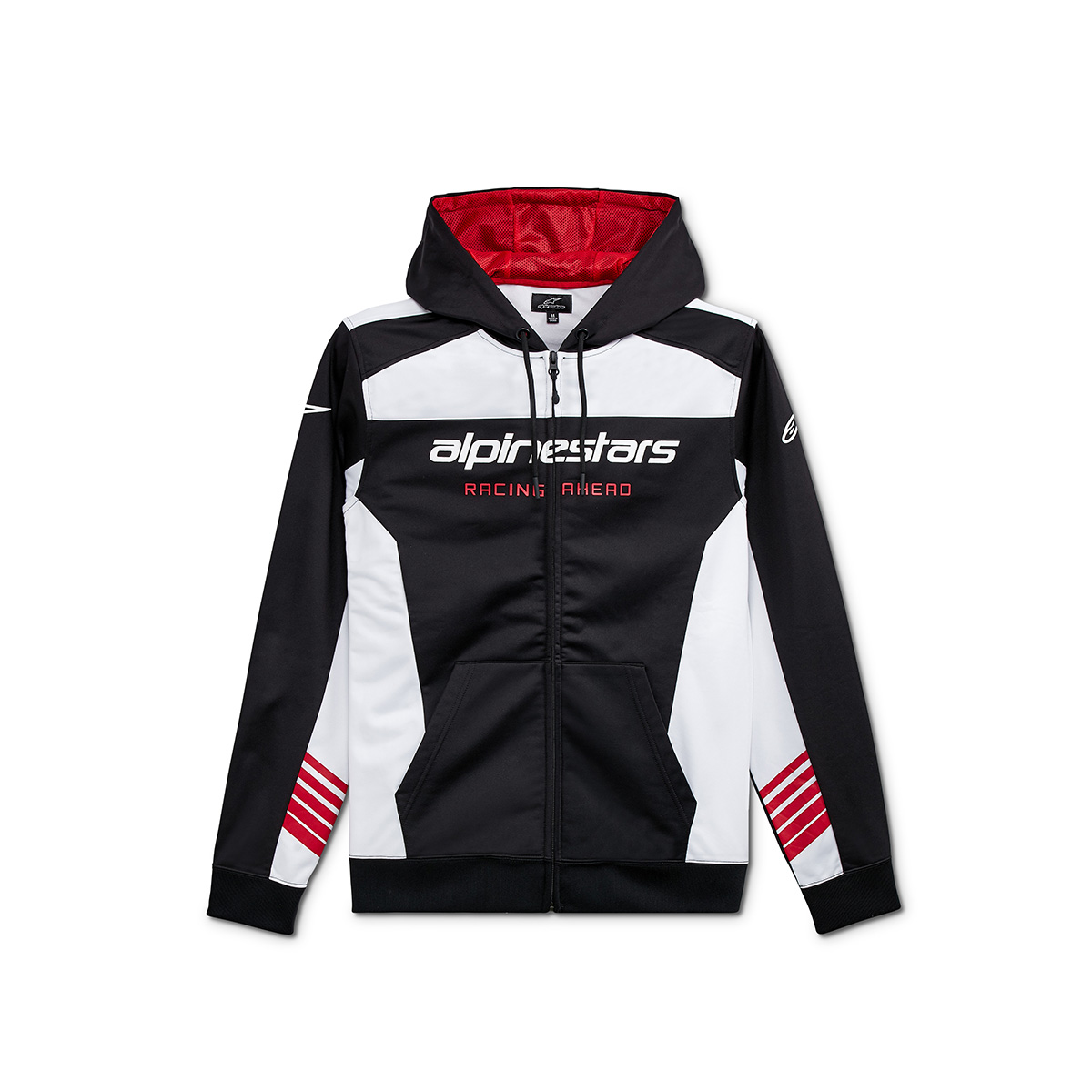 ジャージ素材を使用したレーシングデザインフリース_。フードはドローコードで調節可能。ポリエステル100%。