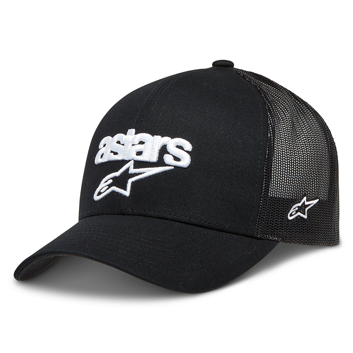 刺繍プリントを施したカーブドビルタイプのスナップバックハット。60%コットン、40%ポリエステル。