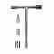 携帯に便利なTハンドルツールセット。 1セットで6ミリ、8ミリ、10ミリ、14ミリのディープソケット及びプラス・マイナスドライバーに対応。 高強度なクロームバナジウム鋼製。