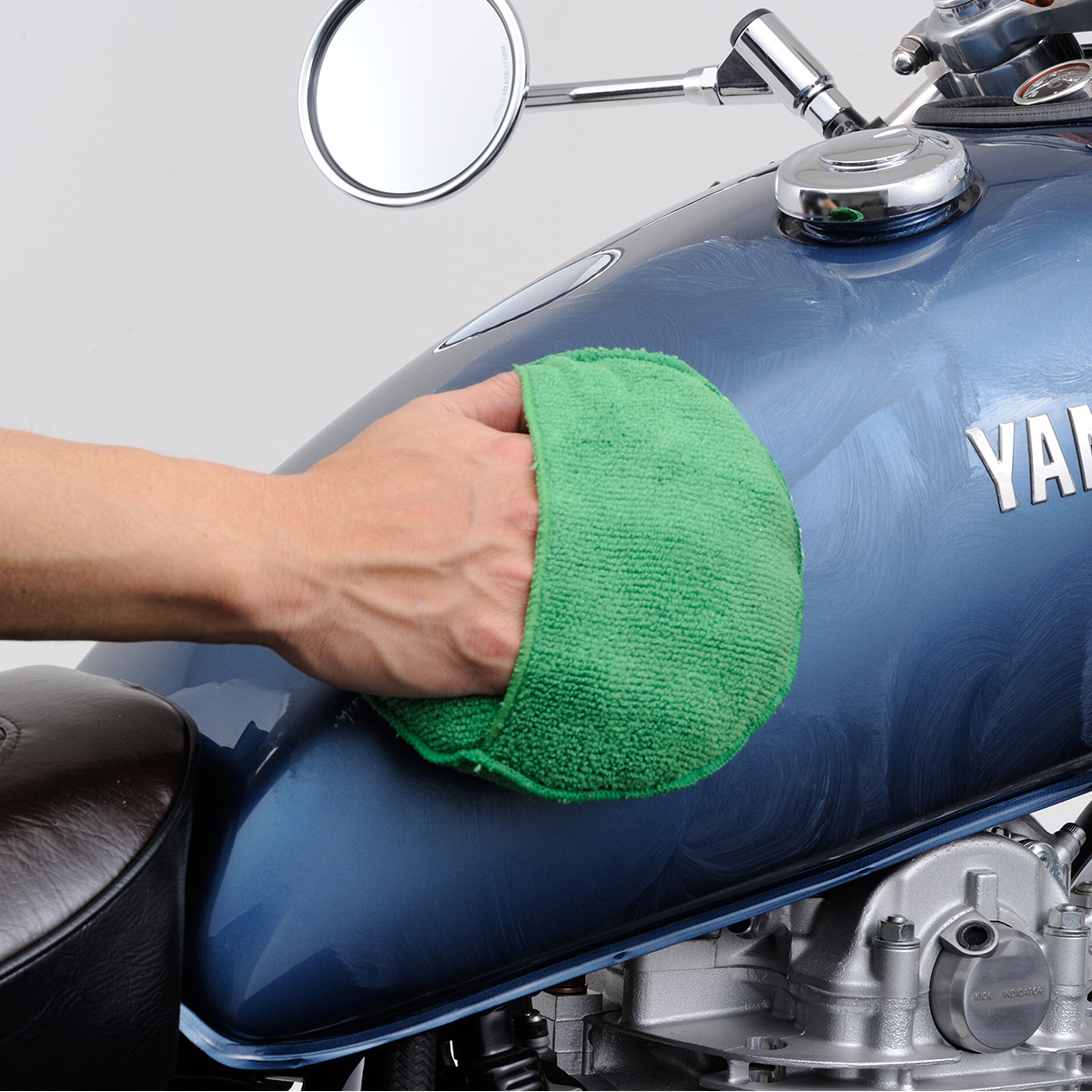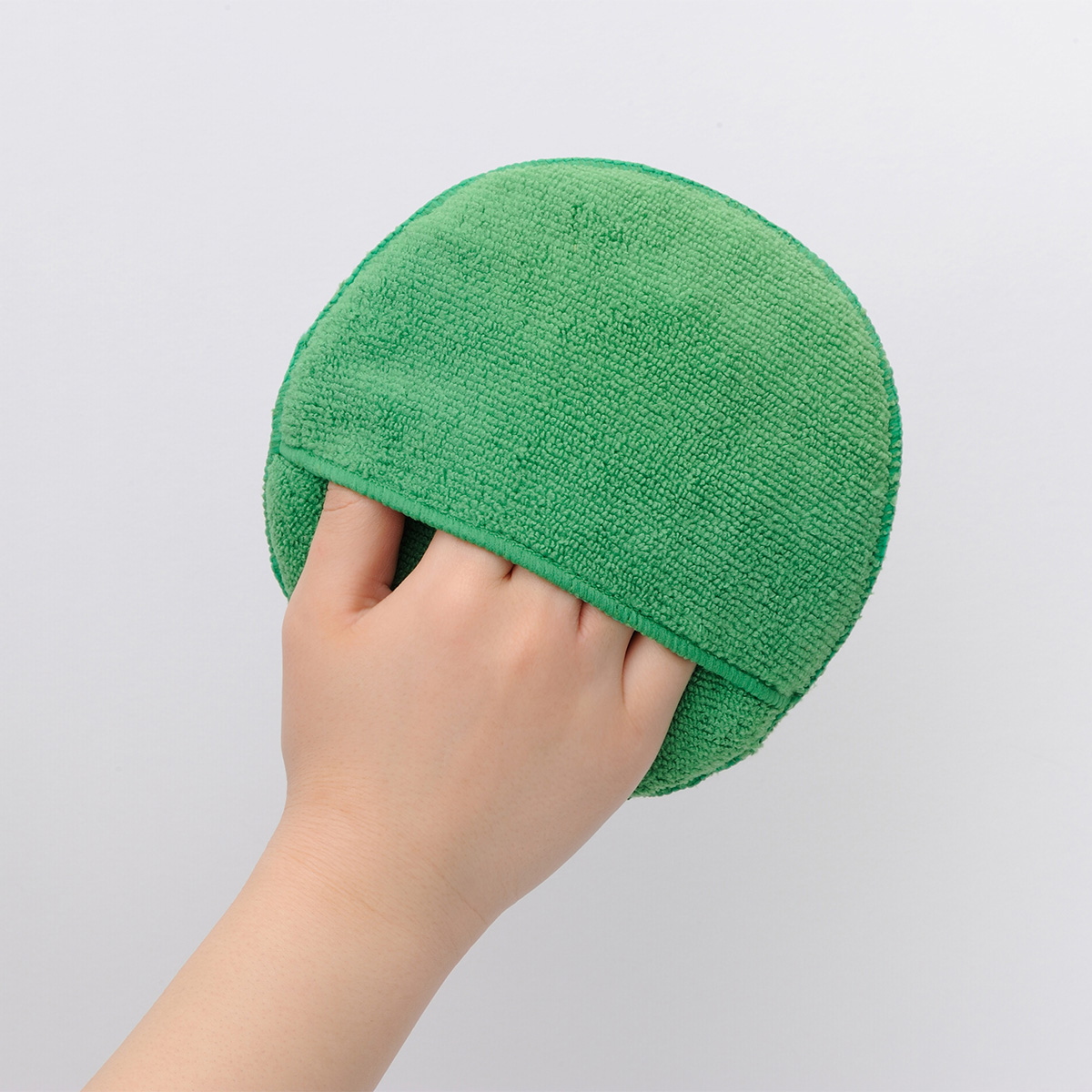 丸形のマイクロファイバースポンジで指先が入るポケット付き。スポンジがあることで車体に傷をつけず、均一に力をかけやすくなっており、曲線が多いバイクのワックスがけやコーティングの施工に最適です。