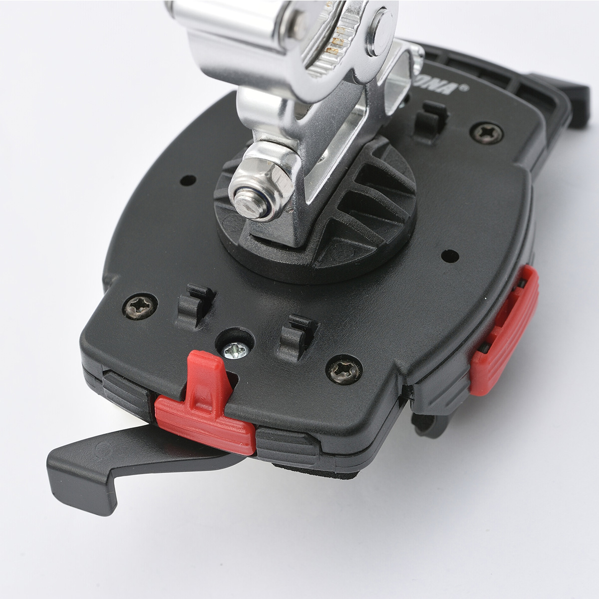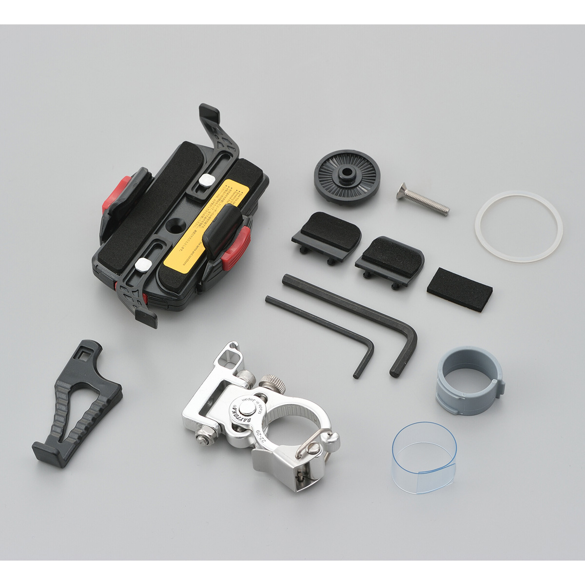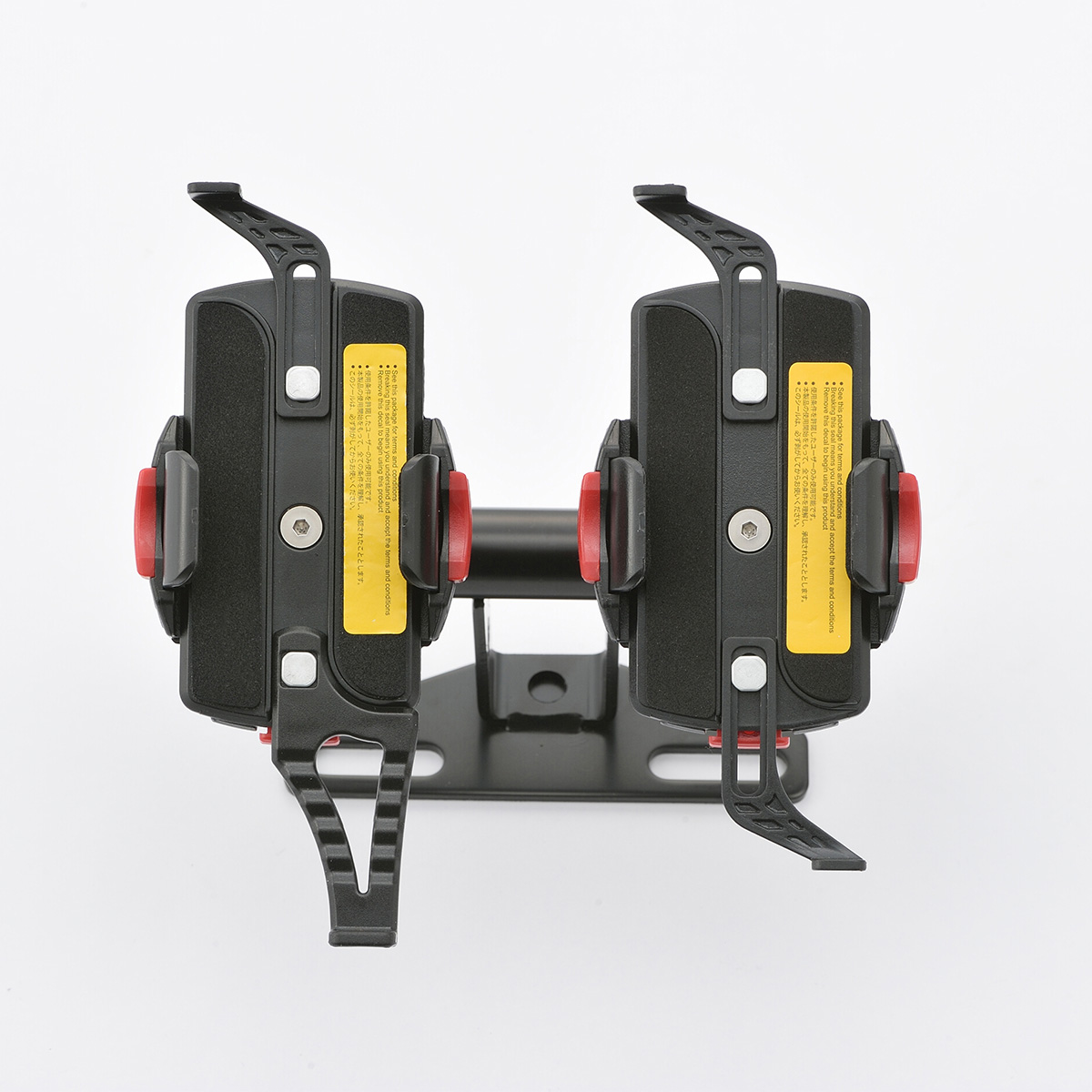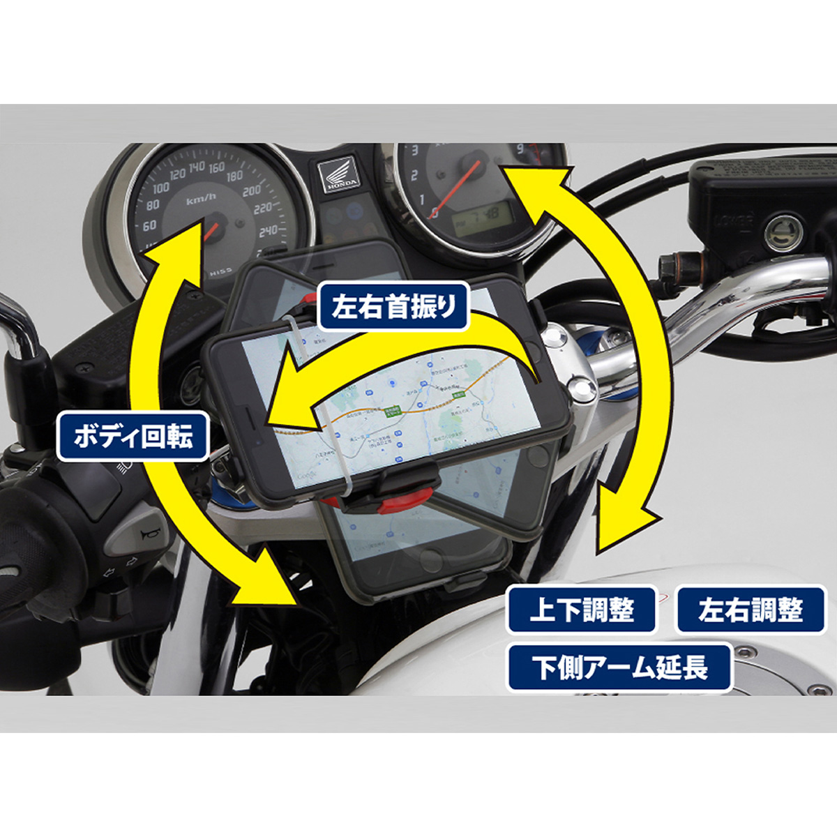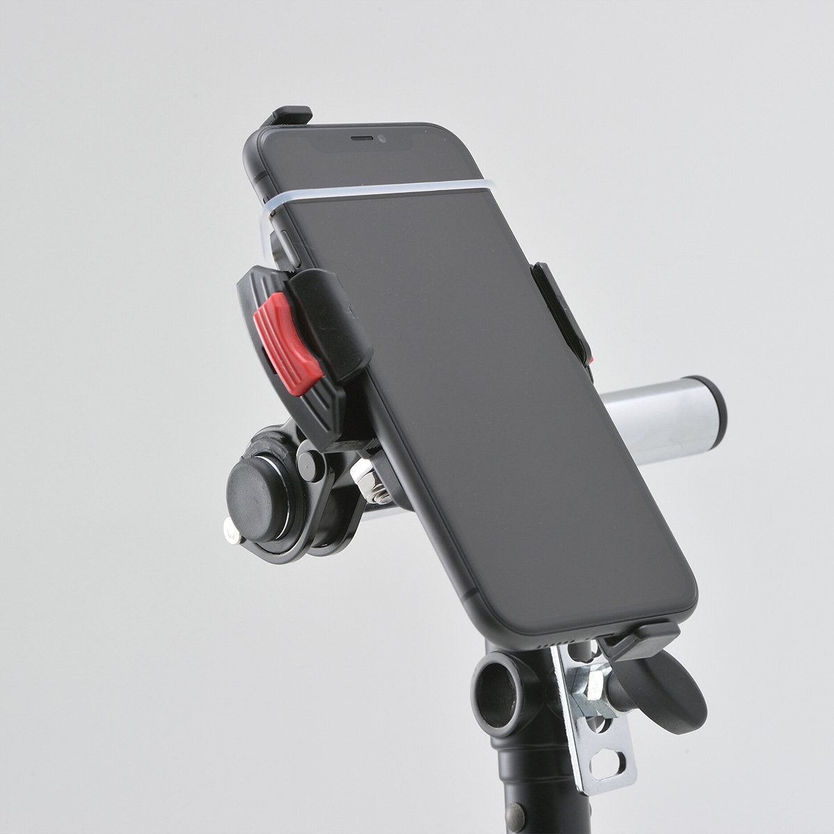 ハンドルバーのどこにクランプしても、スマートフォンの画面をライダーの正面に向けることができる首振りクランプ。