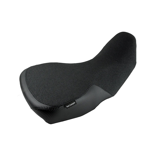 シートカバーはサイド部がカーボン調、上部座面がグリッパーシートとなっており、滑りにくくポジションキープが容易に可能。グリッパーシート下面にはスポンジが付いており、しっとりとした座り心地がさらに向上。シートとフォームの間に付属のウォーターバリアシートを入れることで、水の侵入を防ぐ。