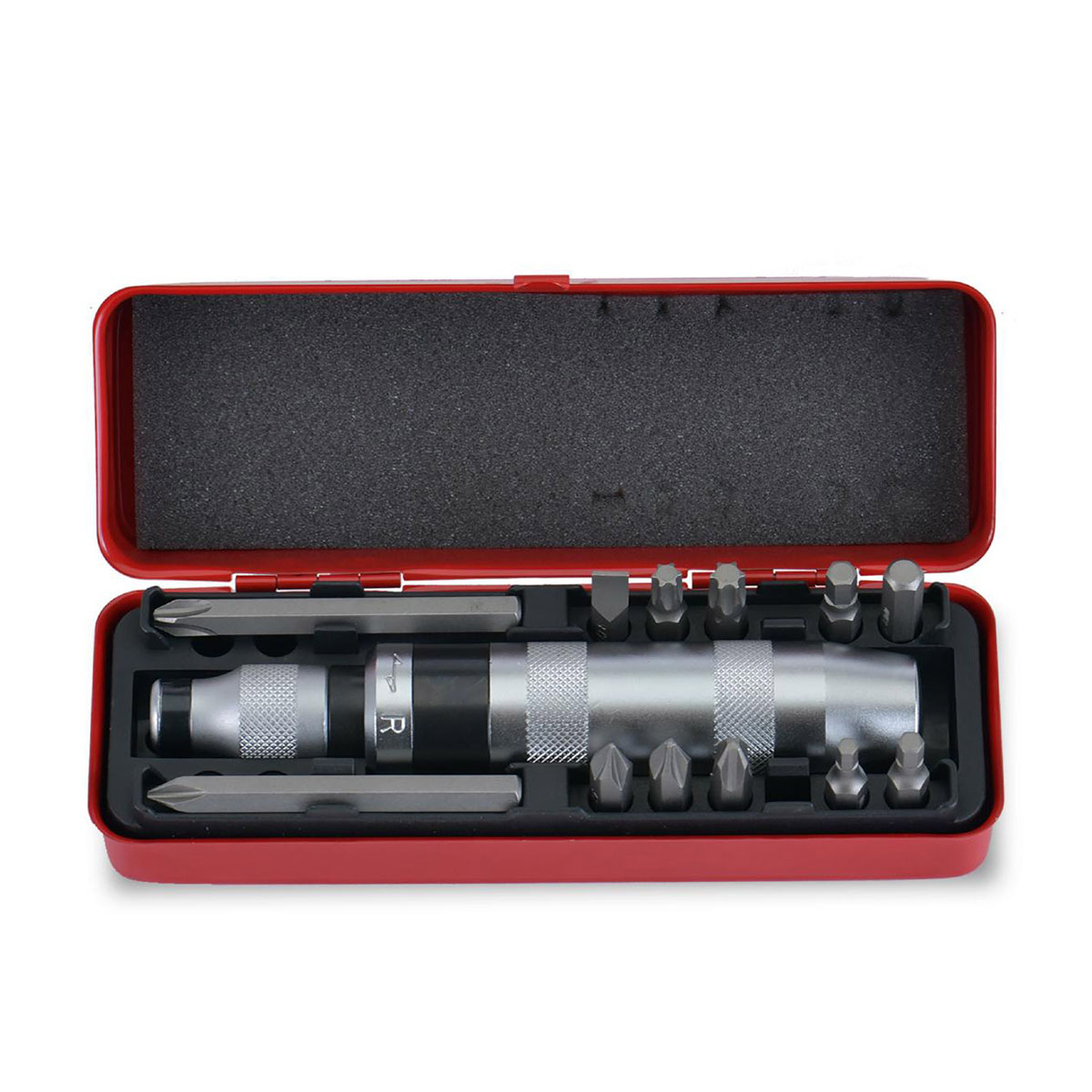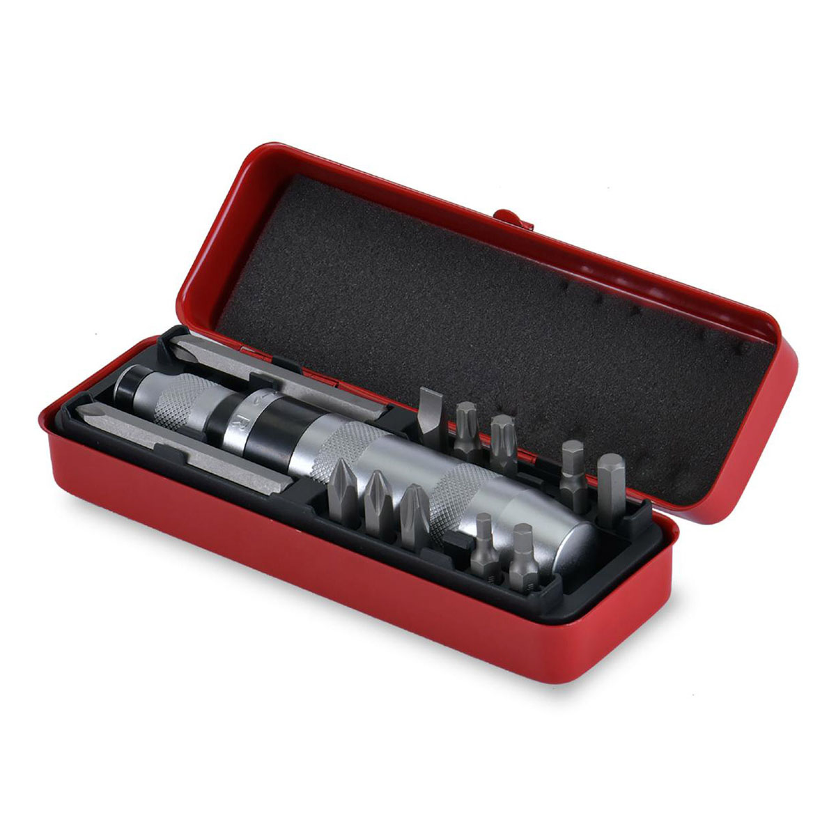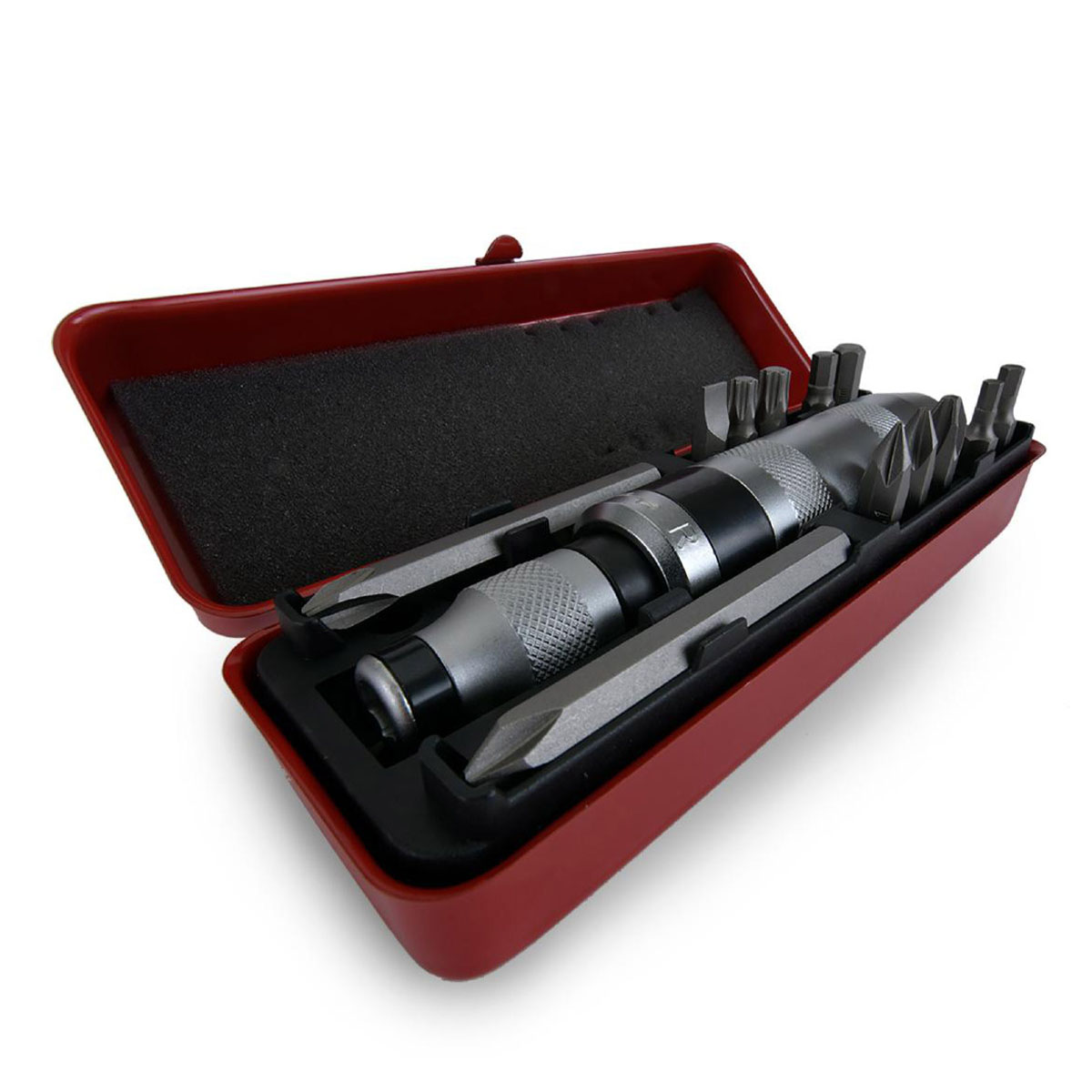 固着したボルトにハンマーで叩いて衝撃を与えながら緩めるショックドライバー。固着しやすい+ボルトやトルクスに向けた厳選されたビットが12本付属◆スチールケースで保管も便利