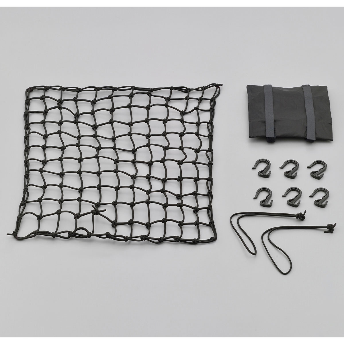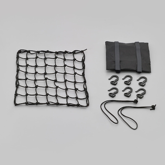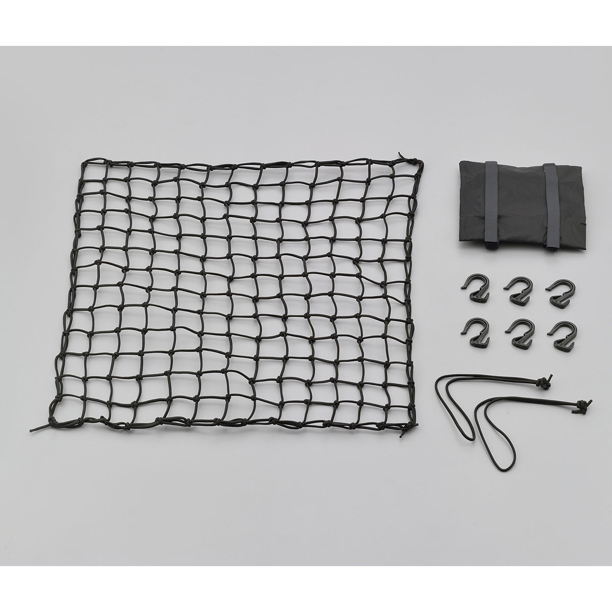 ・収納時に便利なポーチ付。・マス目にむだの出ない、サブコード2本付。・フックはコンパクトかつタグれるタイプで使いやすい。基本機能もバッチリ!・使いやすいコンパクトなフック(6個付)変形や摩耗が少ない強化プラスチックを使用し、H型断面構造で強度のあるコンパクトフック。コンパクトだから使い勝手も良く、ネットをたぐり、サイズ調整も可能な設計です。・小さなマス目、適度なゴム線径約45㎜のマス目で荷こぼれしにくく、実用性を考慮した4.0㎜ゴムで程よい伸び具合と締め付け具合。