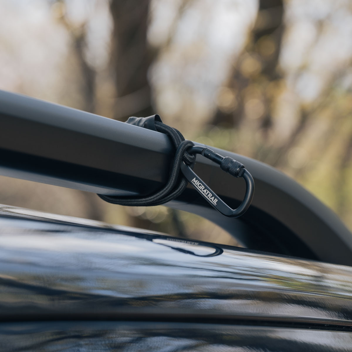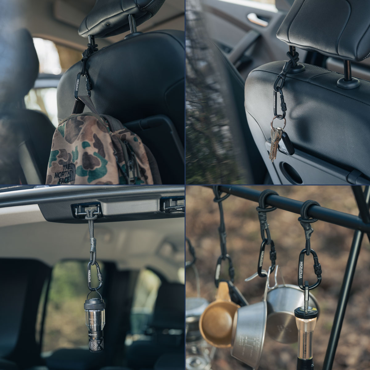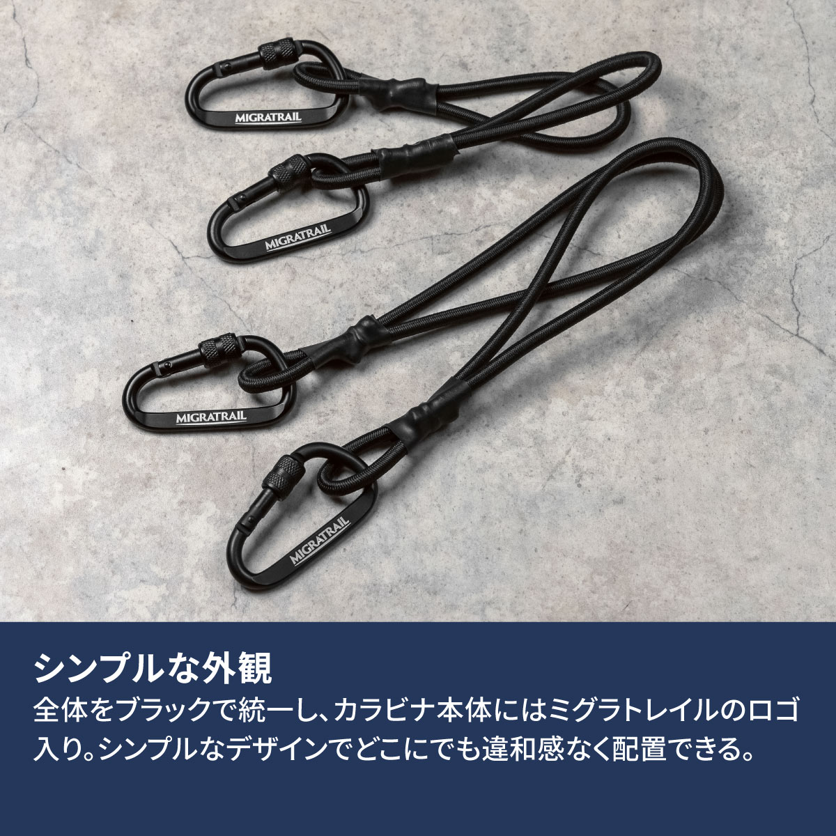車のキャリアとタープとの連結や、車内のあらゆる場所で便利に使える万能コード。 高い強度を重視した素材を選定したことで、タープを張る力にもしっかり耐える。 色をブラックに統一し、カラビナにロゴを配置。アウトドアに馴染むシンプルなデザイン。