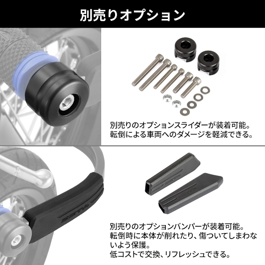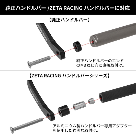 専用バーエンドが付属することにより、純正/ZETA RACING製どちらのハンドルバーにも対応。