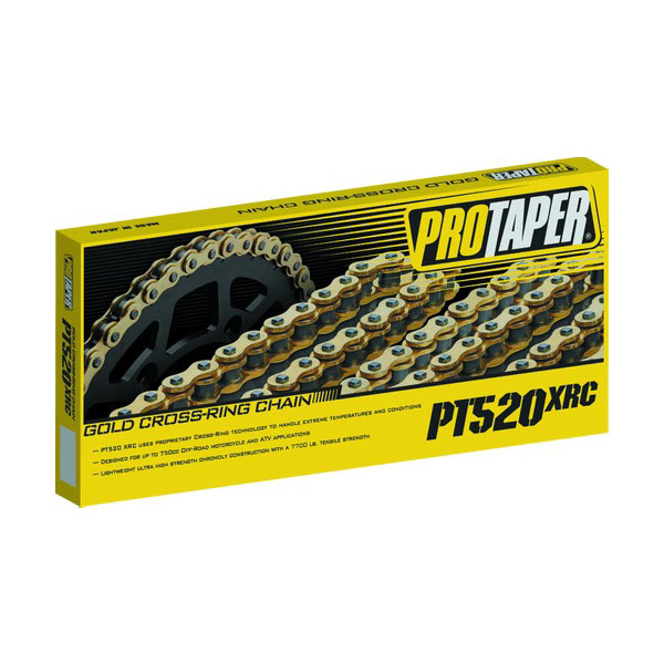 プレミアムゴールドシリーズ Xリングチェーン。PT520 XRCは、オフロード走行やレースにおける極限の温度と条件に耐えるよう専用にテストされた独自のXリング技術を採用。最大750ccのオフロードMXおよびATV用途向けに設計。軽量で超高強度のクロモリ構造、引張強度は7,700ポンド(約3,500kg)。