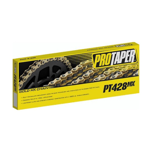 プレミアムゴールドシリーズモトクロスチェーン。小排気量バイク向けに設計されたPT428MXは、大型520 MXチェーンと同等の技術と革新を採用。最大125ccまでの用途に対応。軽量で超高強度のクロモリ構造、引張強度は5,800ポンド(約2,632kg)。