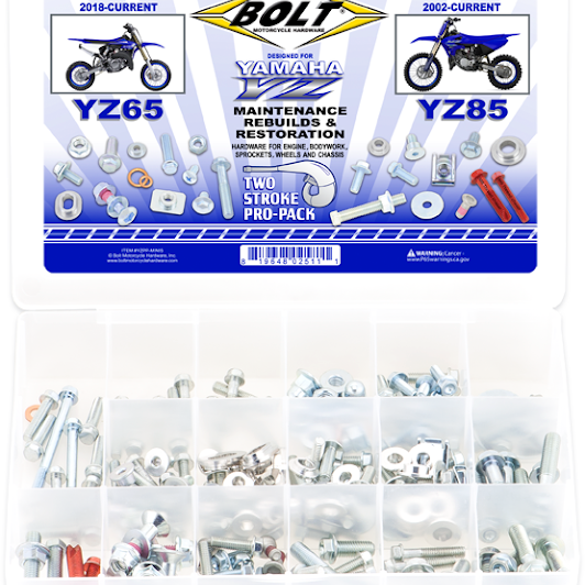 この 2 ストローク プロパックは、YZ65 および YZ85 のメンテナンス、リビルド、補修用に設計されています。エンジン回り、ボディワークファスナー、チェーンアジャスター、ローターボルト、スプロケットボルトのフルセットが含まれています。チャンバー&サイレンサー、フォーククランプ、リアブレーキ、チェーンスライダー、ラジエーター、下部サブフレーム、ハンドルバークランプ、ハンドルバーコントロール用の留め具。スレッドチェイサーが含まれています。