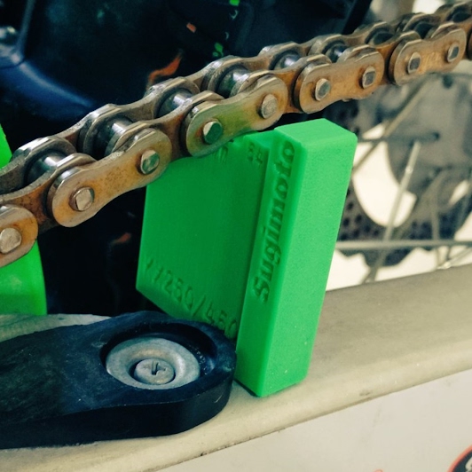 スイングアームとチェーンの間に挟み、たわみをチェックします。一番小さいサイズが入らない場合は、チェーンの張りすぎ。反対に一番大きいサイズでも緩い場合は、チェーンを緩めすぎの目安になります。