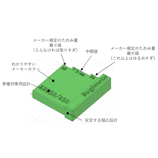 ドライブチェーンのたわみ量を簡単にチェックできるツールです。チェーンの張りすぎ、緩めすぎを防止するため、走行前に短時間でチェックできます。