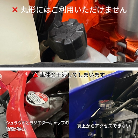 ※丸形ラジエターキャップには使用できません。 ラジエターキャップ上部からアクセス出来る車両にお使いいただけます。 車体の形状、ラジエターキャップの位置をご確認の上お買い求め下さい。