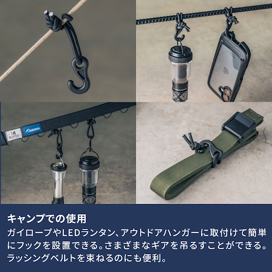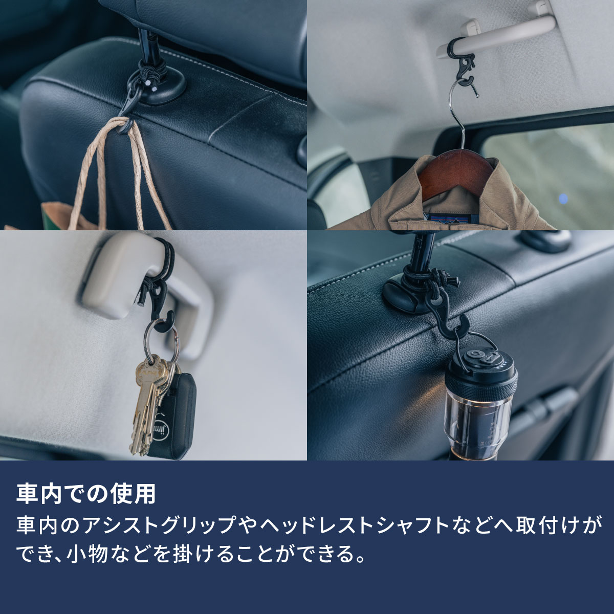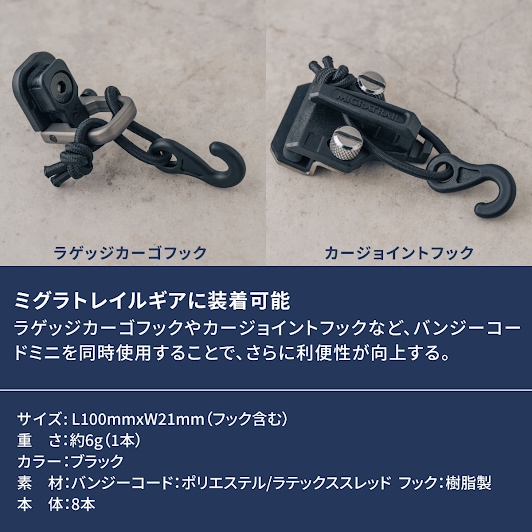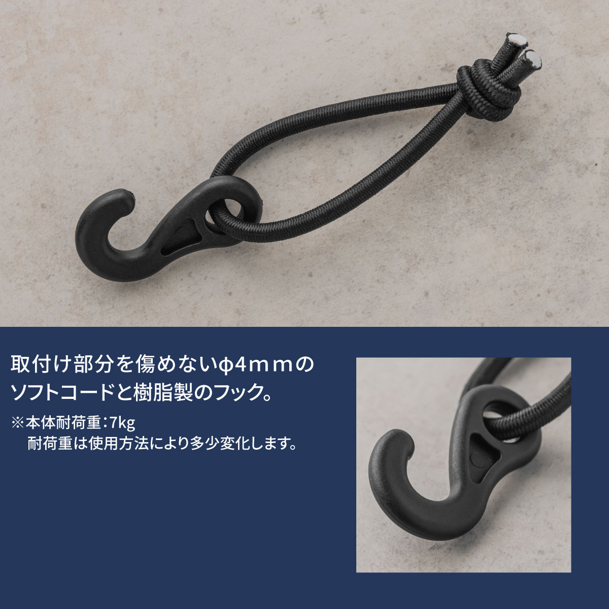 アウトドアギアや車中泊アイテムの固定に最適な、コンパクトサイズのバンジーコード。 車内のハンガーフックやラゲッジルーム、キャンプサイトのポールなど、あらゆる場所に取付け可能。 荷物を吊り下げたり、小物をまとめたり、自由に使える場所を増やせる。