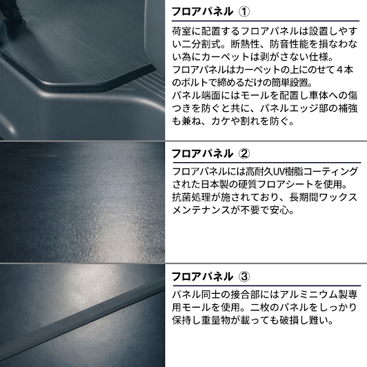 フロアパネルには硬質フロアシートと強度が高いアルミニウム製の接続モール を採用。