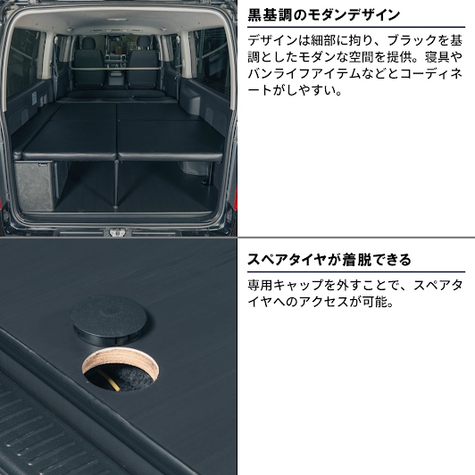 純正の段差を解消し、フラットで歩きやすい床面を形成。荷物の積み下ろしがスムーズになり、車内移動のストレスを軽減。