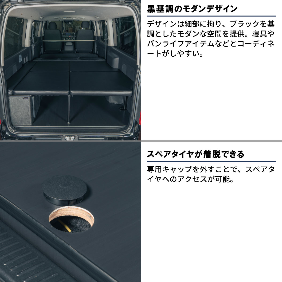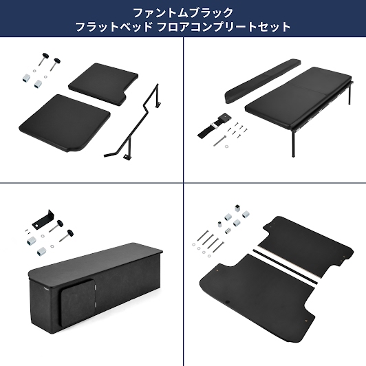 ファントムブラック フルフラットベッド フロアコンプリートセットはフルフラットベッド、サイドボックス、フロアパネルを精密に一体設計し、無駄のないレイアウトと機能美を追求したセット。