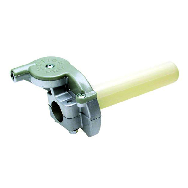 グレーのラバーマッドカバー付きのダイカストアルミニウム製スロットル。22mm径のハンドルバーに適合。国産モトクロッサーの純正品に近いリプレースメントスロットル。KX125/250 92-05, RM125/250 95-05, YZ125/250 96-10, WR250Z 97は純正ケーブルで取り付けが可能。CR125 93-03, CR250 90-04, CR500 90-01にはMotion Pro ケーブル(品番:01-0713)を使用。Motion Pro ケーブルを使用すれば、その他色々な車種に取り付けが可能。ポップアウトエンドのナイロン製スロットルチューブ付き。