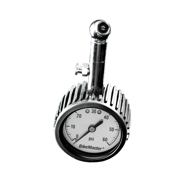 コンパクトで携帯にも便利なタイヤゲージ。減圧可能なリリースバルブ付きで便利。チャック部分が回転するので様々な角度で測定が可能。