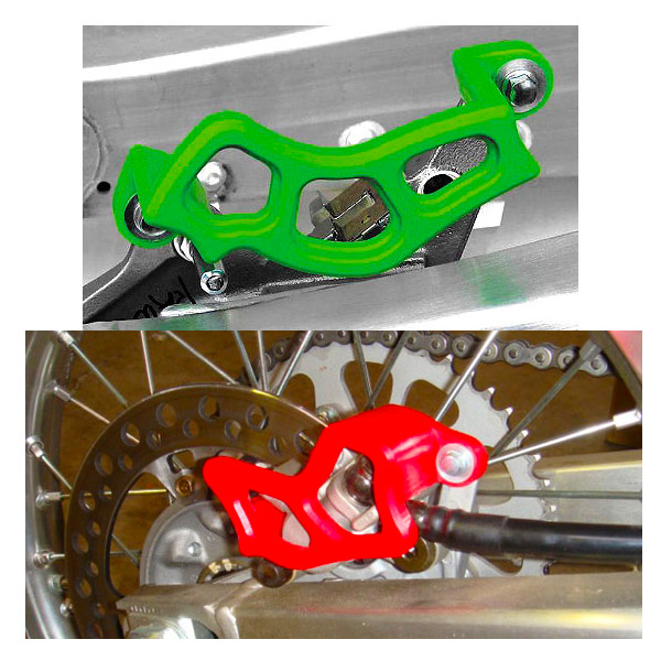 耐久性と衝撃吸収性能に優れた樹脂製のリアキャリパーガード。形状記憶設計によって変形しても形状が戻りやすい。排泥性、冷却性に優れたデザイン。