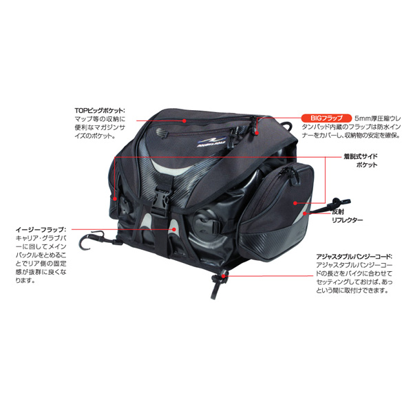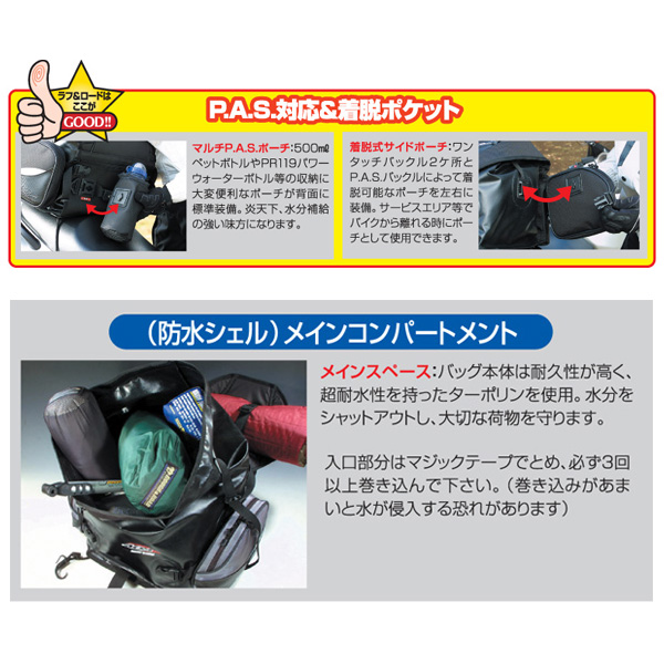 AQADRYシリーズの定番商品。ウィークエンドツーリングに最適なサイズ。メインスペースは防水仕様で天候の急変でも安心。左右のポケット(非防水)は晴天時は小物入れとして出し入れしやすくなっており、雨が降ってきたら本体から切り離し本体に避難させることが可能なシステム。晴天時の使い易さと防水性を両立した使い勝手のよい全天候型の防水シートバッグです。