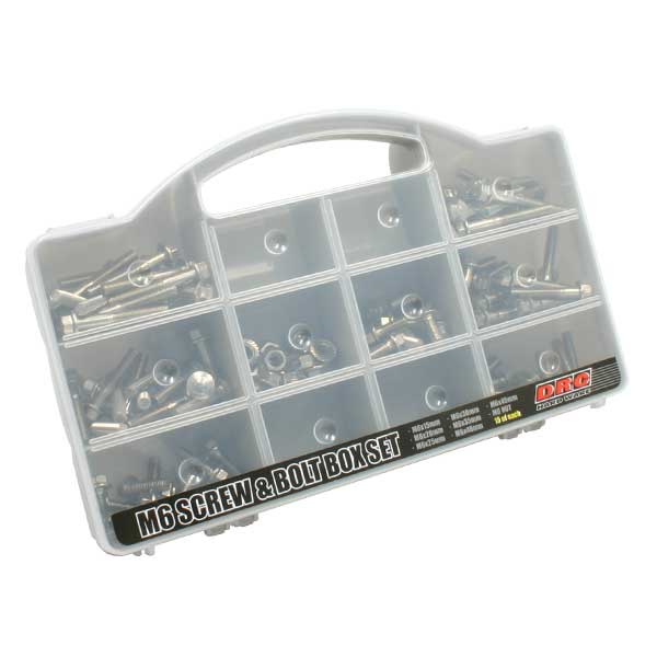 10mm~35mmまでのM6ステンレスキャップボルトとM6ステンレスフランジナットが各15個入ったお得な箱入りセット。総合計105個。