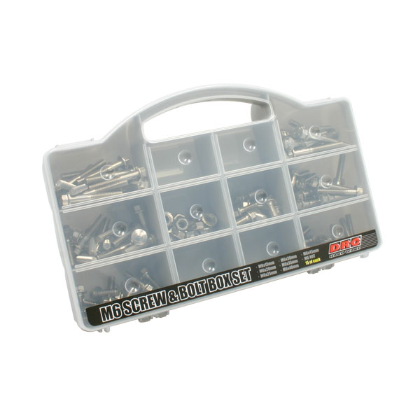 10mm,15mm,20mm,25mm,30mm,35mmまでのM6ステンレスフランジボルトとM6ステンレスフランジナットが各15個入ったお得な箱入りセット。総合計105個。